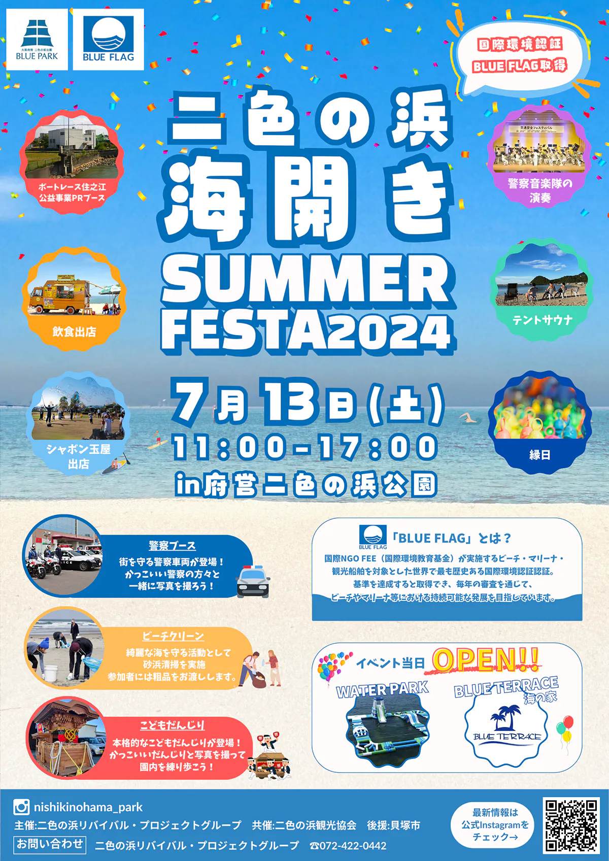 2024/07/09 23:047/13(土)に二色の浜海水浴場の海開きの日に合わせたイベントが開催されます!二色の浜公園の夏の到来を知らせる夏のビッグイベントです。二色の浜海水浴場は、今年、国際環境認証ブルーフラッグを取得し「きれいで安全で誰もが楽しめる優しい」ブルーフラッグビーチとしてはじめての海開きを迎えます。海開きの式典とブルーフラッグの旗を掲揚する式典も行われますのでぜひお越しください!コンテンツ内容・警察音楽隊による演奏・こどもだんじりの登場!・パトカーや白バイなどの街を守る警察車両の展示・大阪府都市ボートレース企業団による、貝塚市内での公益事業のPRブース・BLUE FLAG、関西万博のPRブース・テントサウナの設置他にも地元泉州を中心とした人気飲食店による飲食ブース、子どもたちが楽しめる縁日ブースも登場いたします。イベント名:海開きSUMMER FESTA2024主催:二色の浜リバイバル・プロジェクトグループ共催:二色の浜観光協会後援:貝塚市開催場所:府営二色の浜公園BLUE PARK開催時間:2024年7月13日(土)11:00-17:00 もっと見る