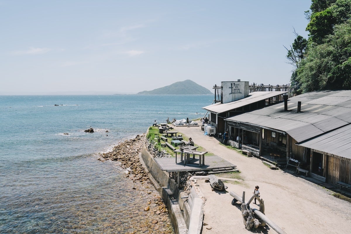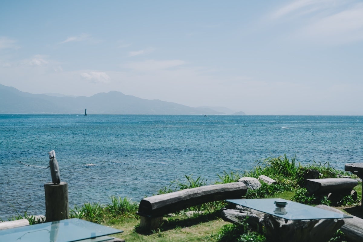 ▲糸島半島の突端にあるまたいちの塩の製塩所「工房とったん」からの眺め