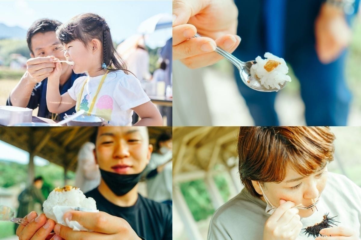 糸島は、海も山もある豊かな自然に囲まれた場所です。田園地帯が広がり、新鮮でおいしい食材があふれています。イベントでは、田んぼの一角で、この地で収穫されたお米を自分たちで炊き、今朝どれのウニの殻を自分の手で割って、炊き立てのごはんにのせていただきます。おいしい体験は、人を笑顔にさせてくれます。