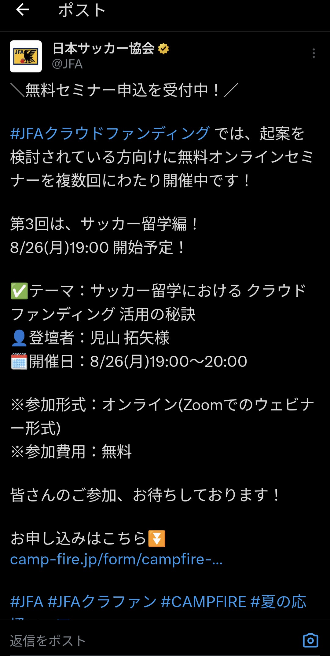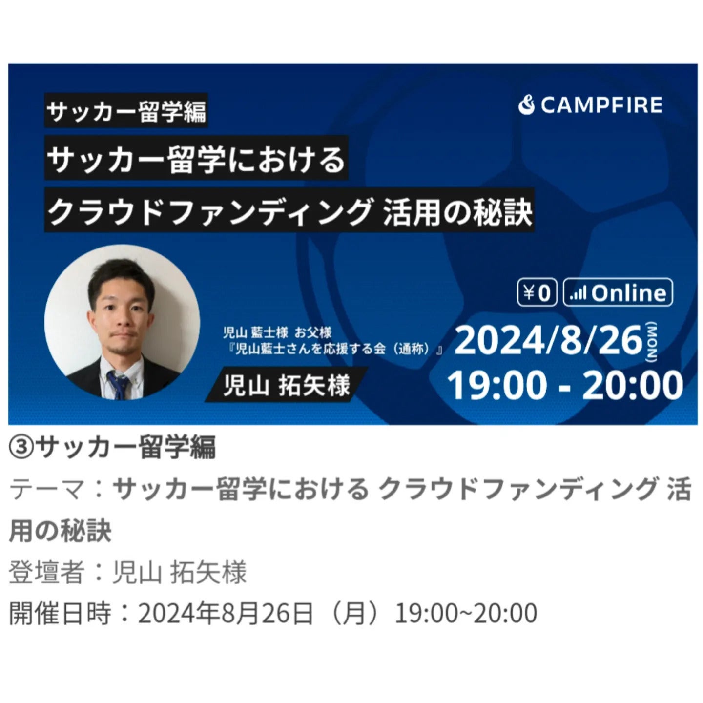 JFAクラウドファンディング『夏の応援フェア』特別セミナーへ登壇します。2024.8.26(月)19-20サッカー留学におけるクラウドファンディング活用の秘訣↑こちらの特別セミナーに登壇することになりましたので、ご報告いたします。また、運営側から拡散のご依頼がありましたので、可能な範囲で拡散いただけますと幸いです。https://camp-fire.jp/form/campfire-onlineevent-jfa-seminar_summer_2024今後とも応援よろしくお願いいたします。