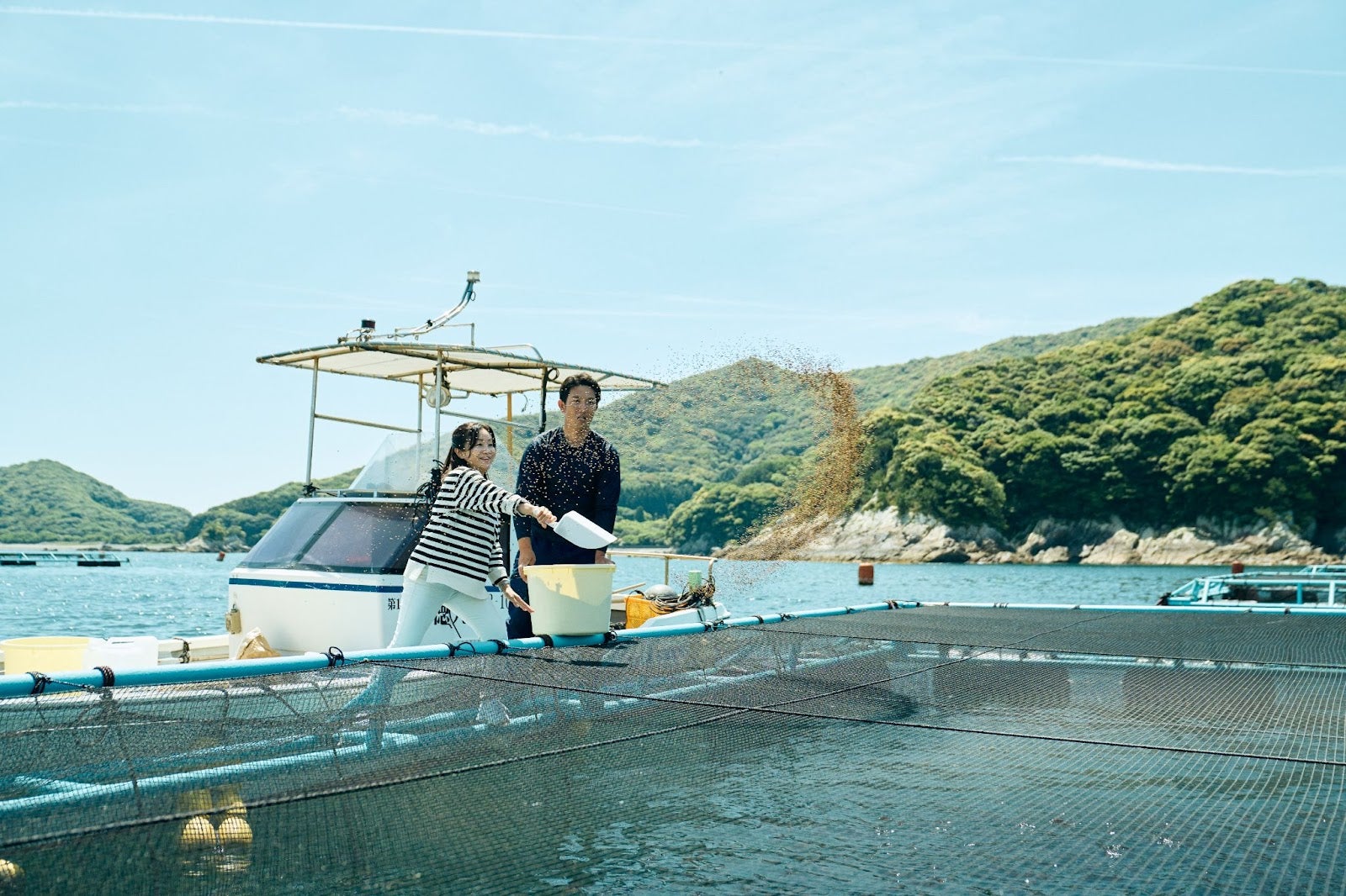 (養殖についてのお話を聞いた後、現場に行って養殖の仕事(餌やりや魚運び)を体験する)
