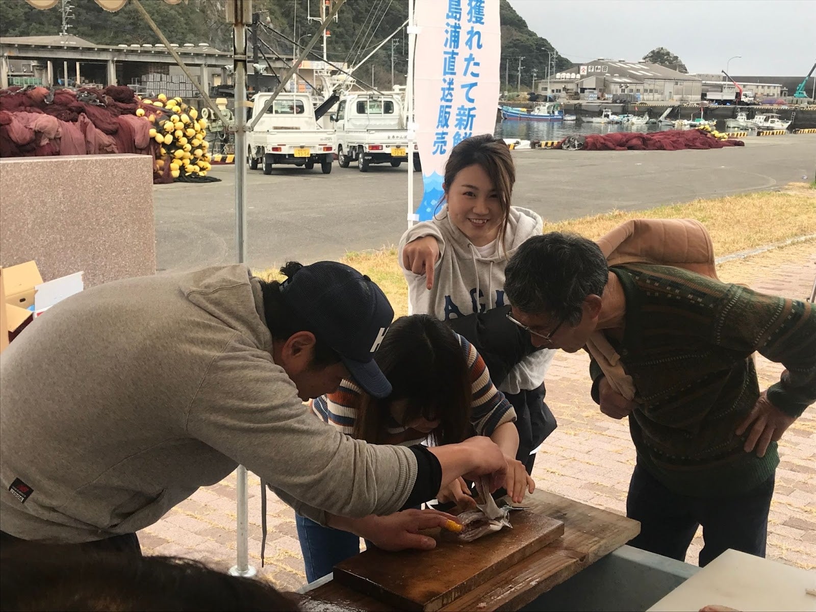 しまうら真鯛についてのお話を聞いた後、現場に行って養殖のお仕事(餌やりや魚運び)を体験する予定です