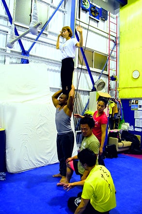 上に乗っているあみさん(コントーション※)を、支えるジェフ(空中ブランコ・アクロバット)、