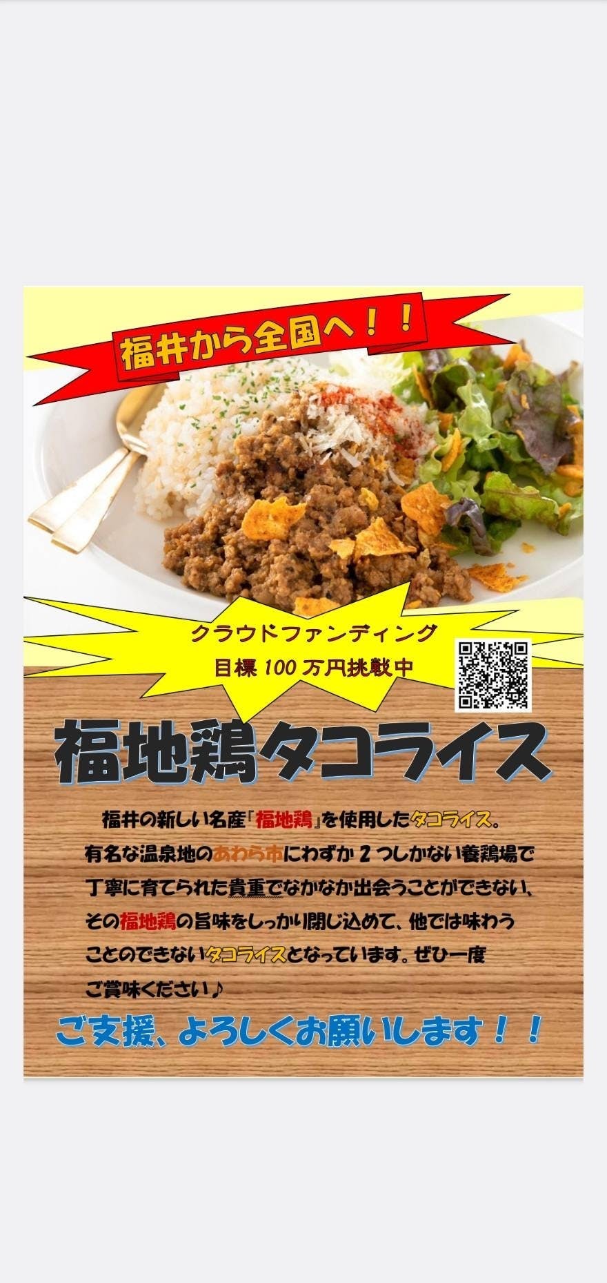 私たちの目標は、福地鶏を使用したタコライスを通じて、全国の皆さんに福井の食文化とこの地域の魅力を知っていただくことです。このプロジェクトを成功させることで、地元の特産品である福地鶏の消費を促進し、地域経済に貢献することも期待しています。また、その際に福井県の福地鶏使用認定許可も取得しています。北陸新幹線も開通し、関東の方も来ていただける今がチャンスだと思っています。たくさんの方々に福地鶏のおいしさを知っていただき、福井のおいしい食材がカニ以外にもあることを認識していただきたいと思います。さらに、出来立てを真空でお届けしますので、夜のご飯に簡単に調理可能です。主婦の強い味方になれると思います。