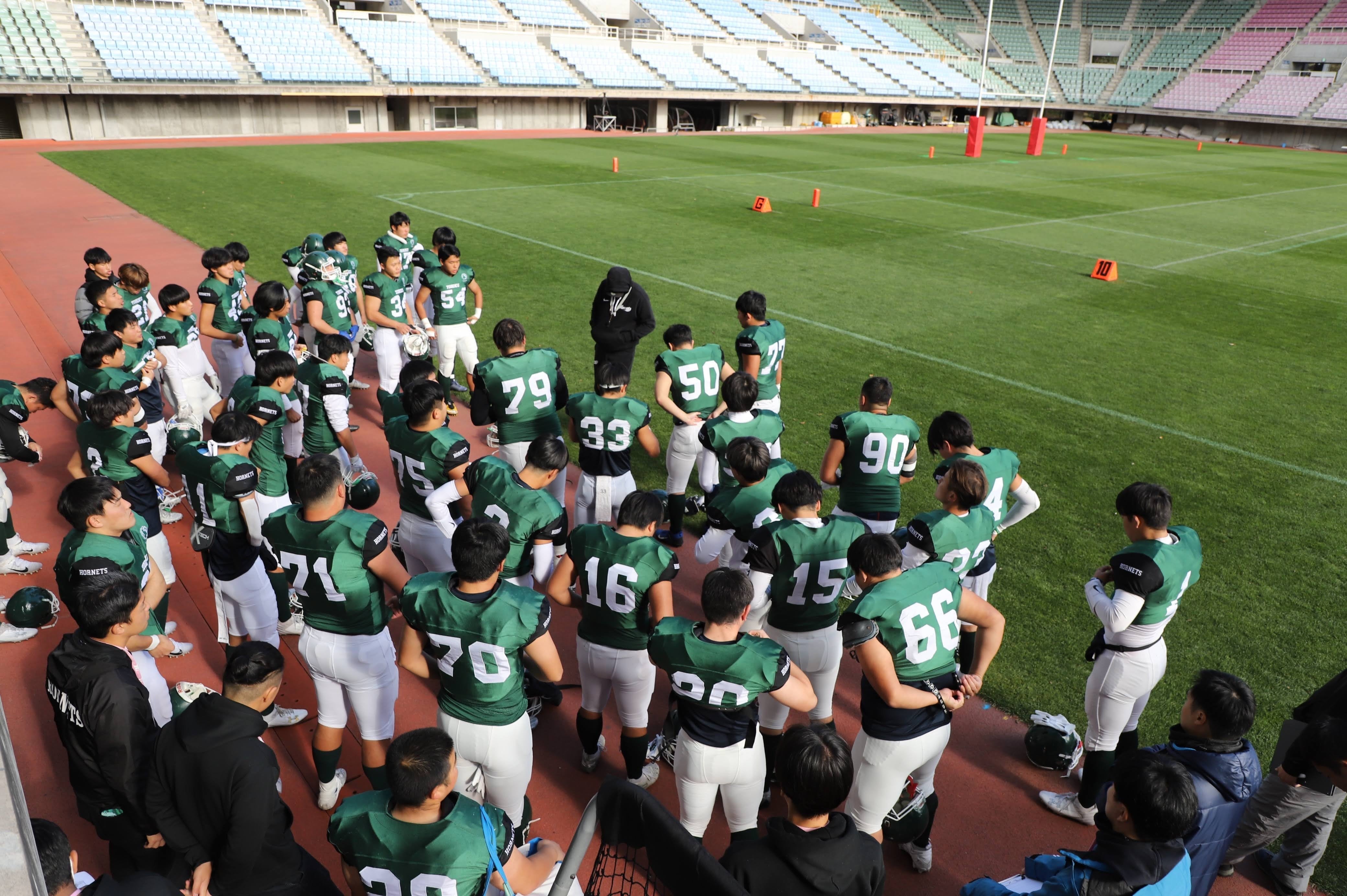 私たちHORNETSは、1979年の創部以来45年、「甲子園ボウル出場」を目指して活動してきました。史上初の地方大学による甲子園ボウル出場を成し遂げることでフットボール界の歴史を変えるべく、選手、スタッフ、コーチ一丸となって挑戦を繰り返しています。