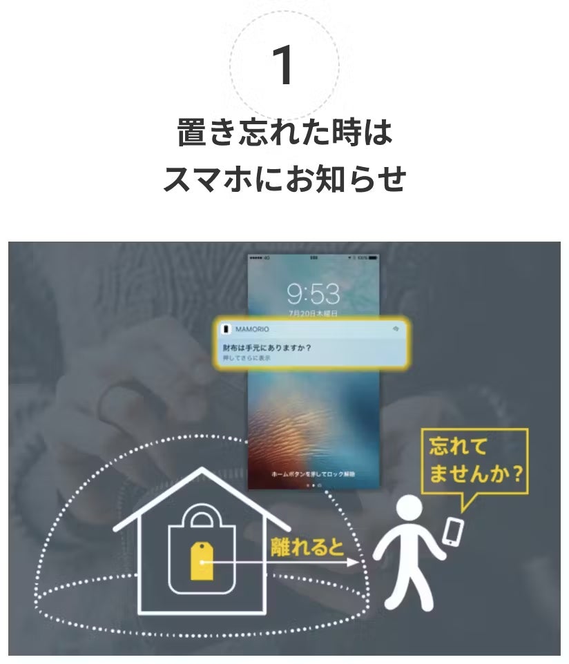 MAMORIOから一定の距離が離れたらスマホに通知を送り、事前に落とし物や忘れ物を防ぐ「持ち物チェック機能」がついています。