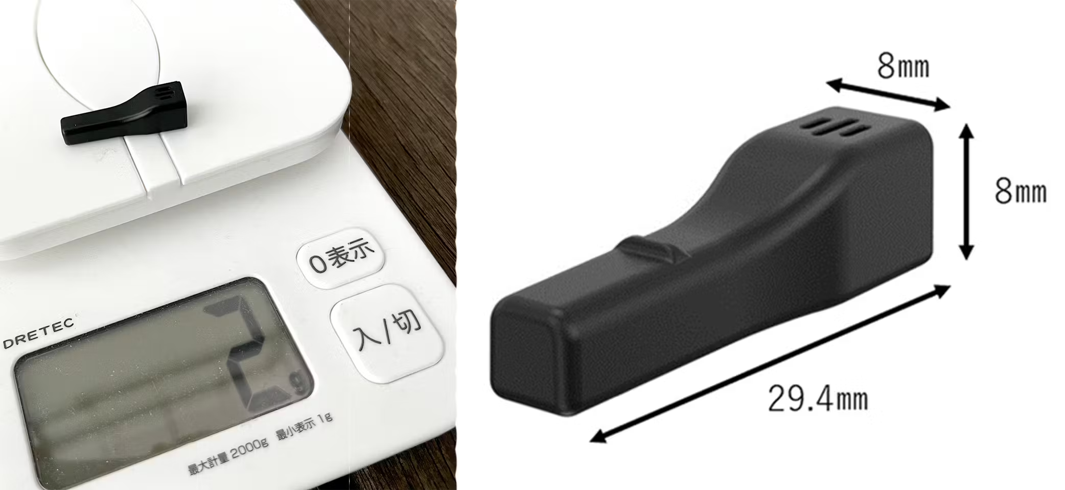 MAMORIO MEGANEの形状は、長さ3cm以下、最も太いところでAirTagと同じ厚みの8mm、細いところだと5mm。さらに重さは、わずか2gのMAMORIO史上もっとも小さいサイズを実現しました。
