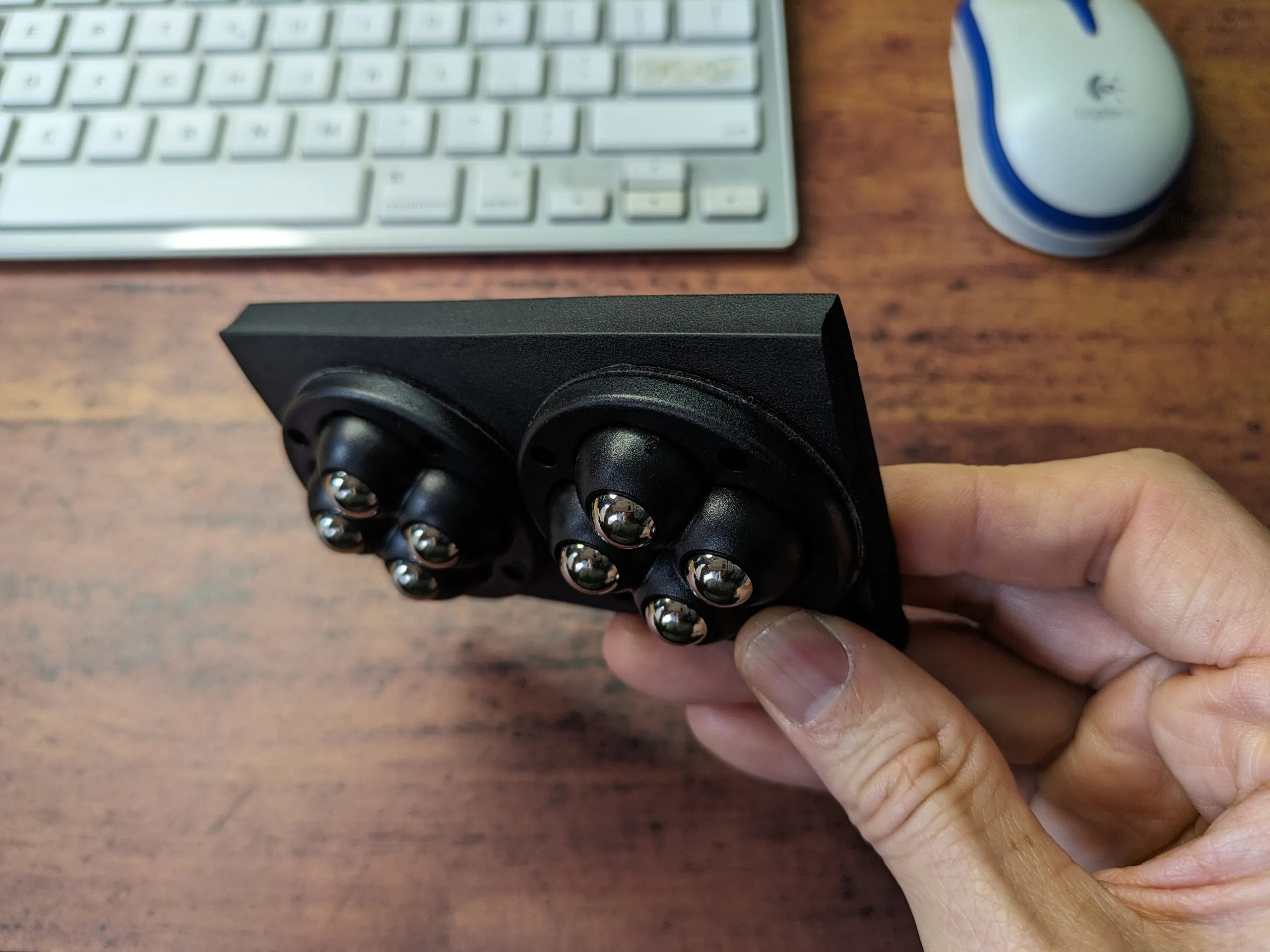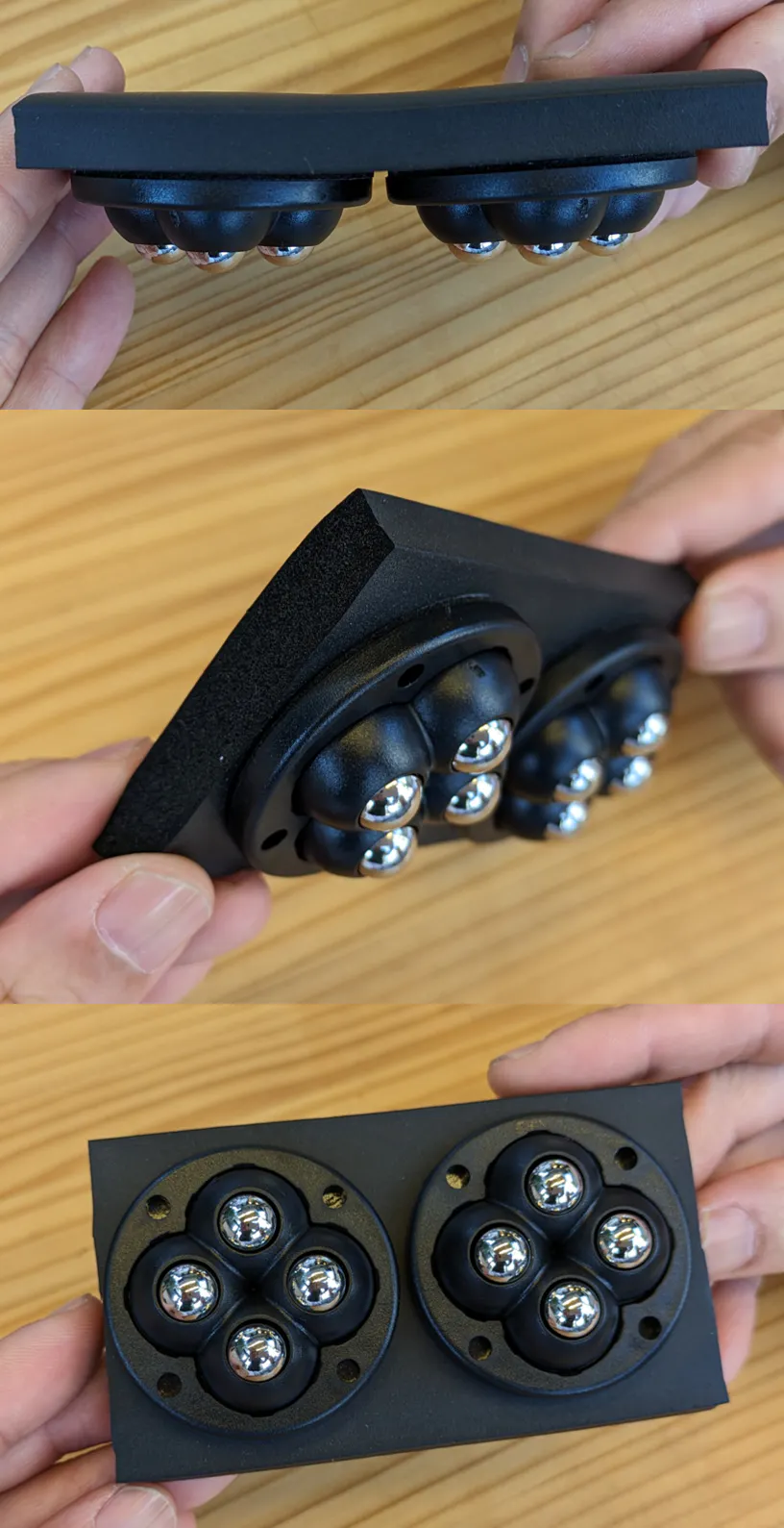 球体ではなくて、車輪がついたアームレストもありました。しかし、これは行きたい方向に行くのに、一瞬、車輪が向きを変えるために軌跡が揺らぎ、腕が直線的に動いてくれませんでした。「なんだ、この一瞬、グニっとした揺らぎは!」と気持ち悪く思う瞬間でした。