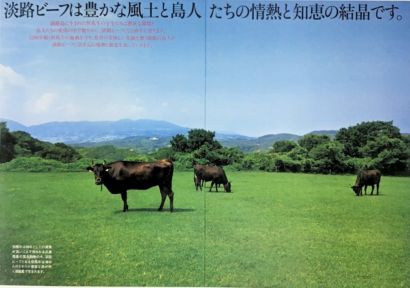 淡路ビーフ。淡路牛。ビーフと肉を言い換えているだけではなく、2つは異なる牛肉です。淡路牛は淡路島生まれか淡路島での飼育期間が他の場所より長い国産牛の肉。対して淡路ビーフは、淡路島に生まれた但馬牛の厳しい品質基準に則した認定条件をクリアした牛肉だけに許されるブランド名。淡路島の豊かな自然と規格化された飼育環境の下で安全に生まれた但馬牛の牛肉に与えられる最上級品質の名称です。