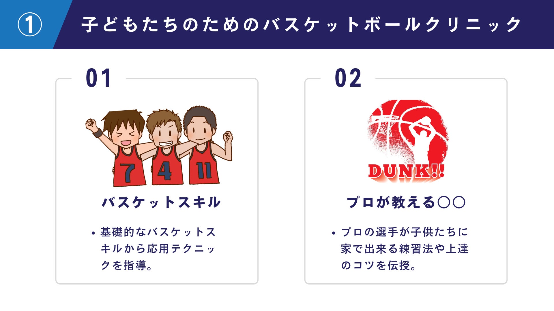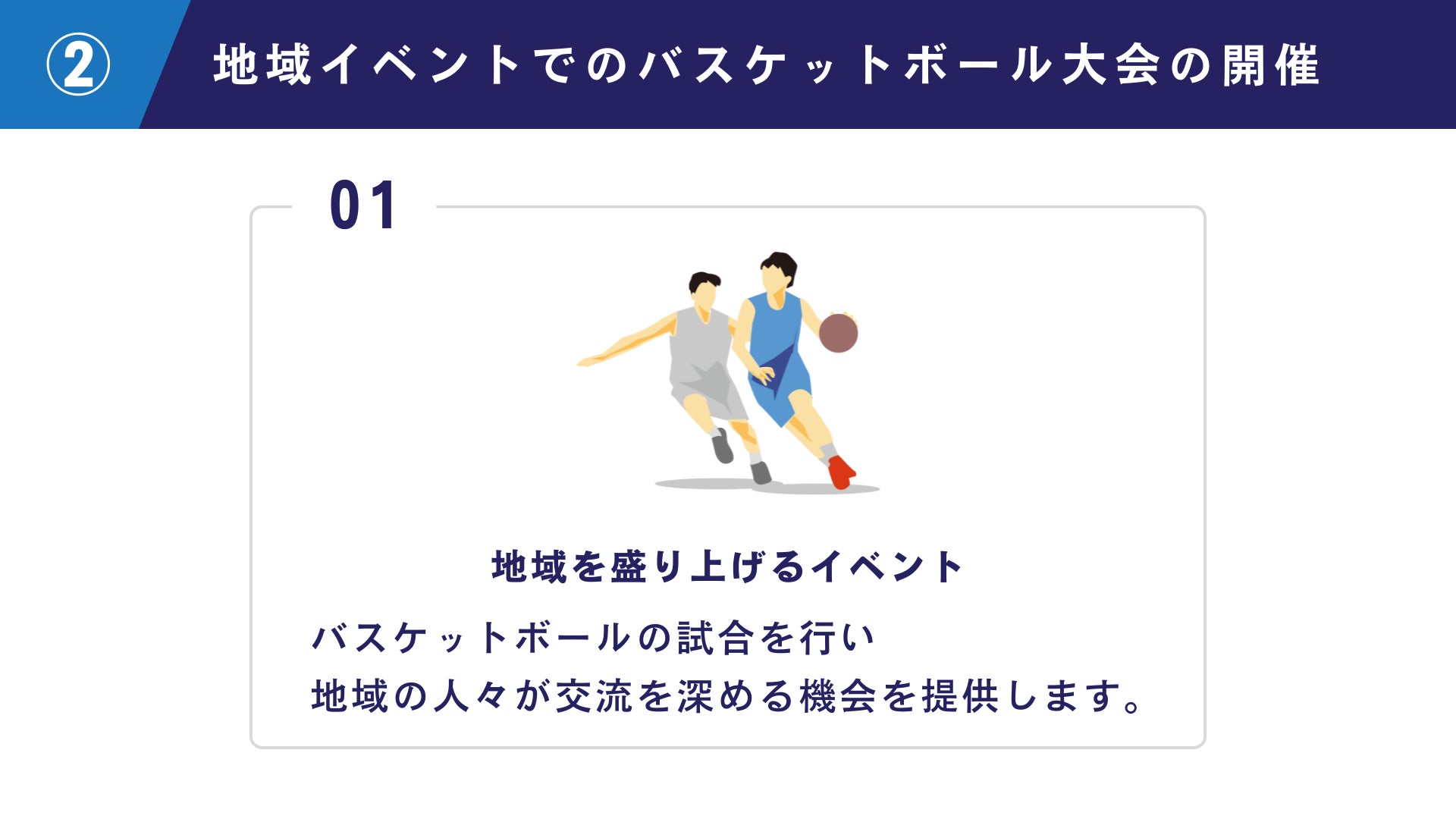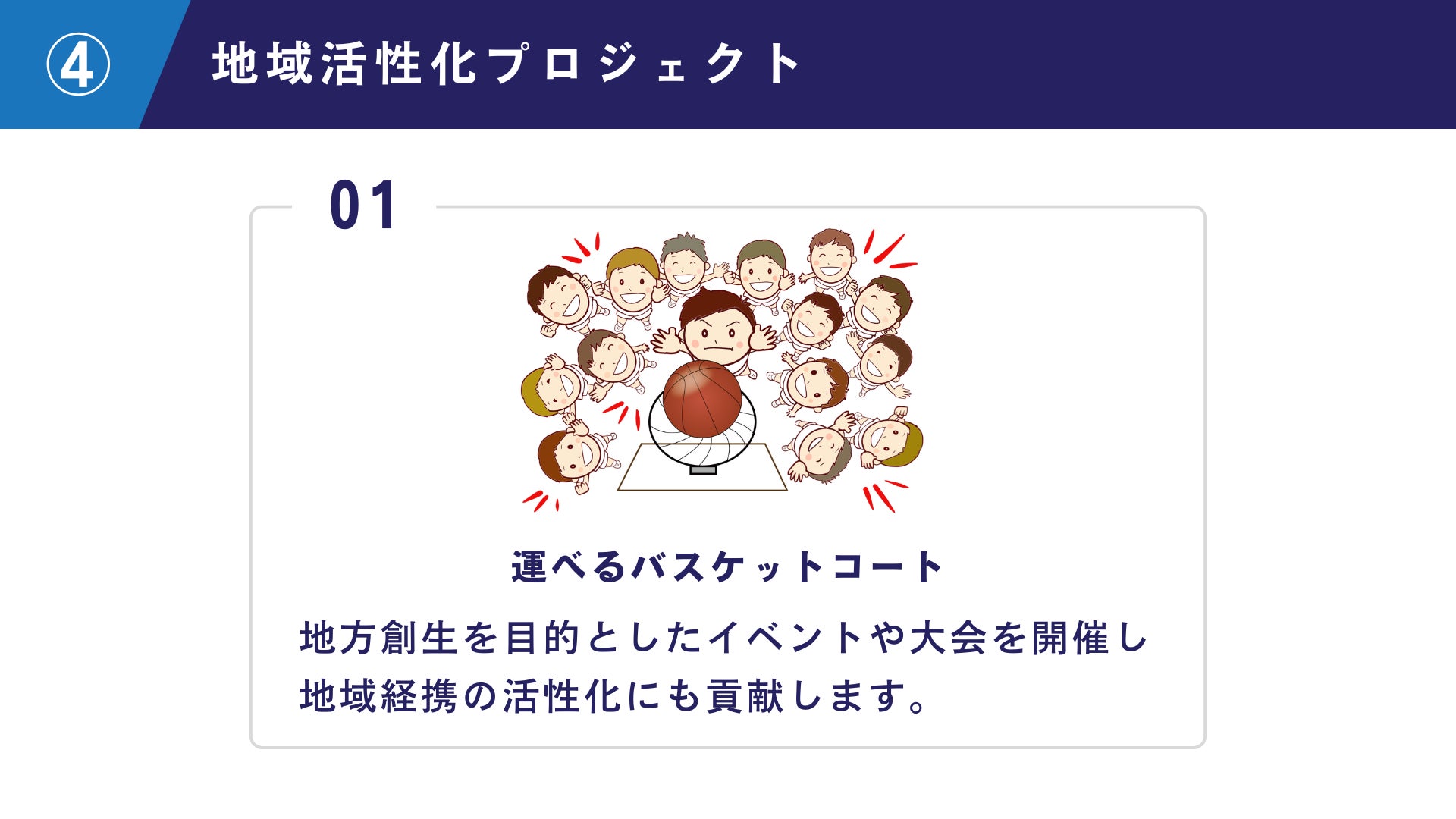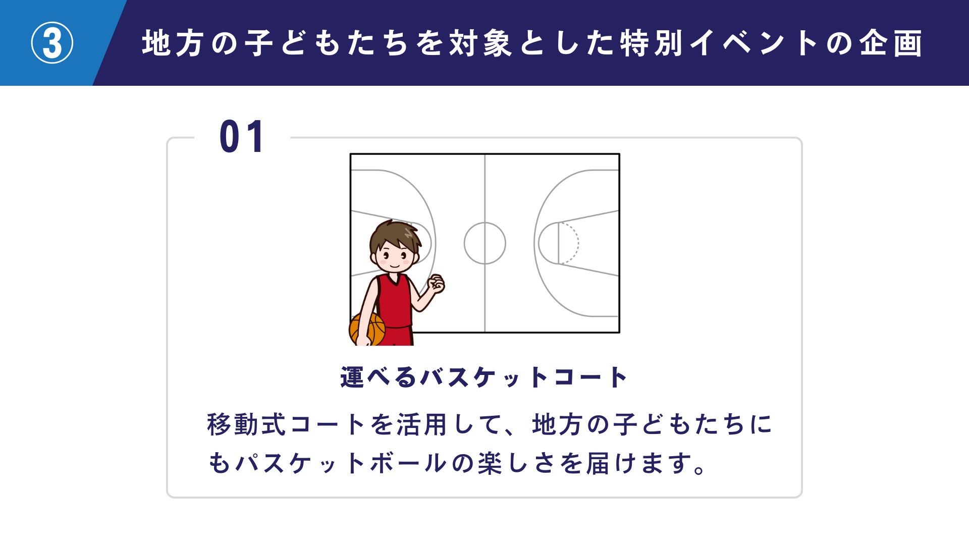 - 移動式コートを活用して、地方の子どもたちにもバスケットボールの楽しさを届けます。