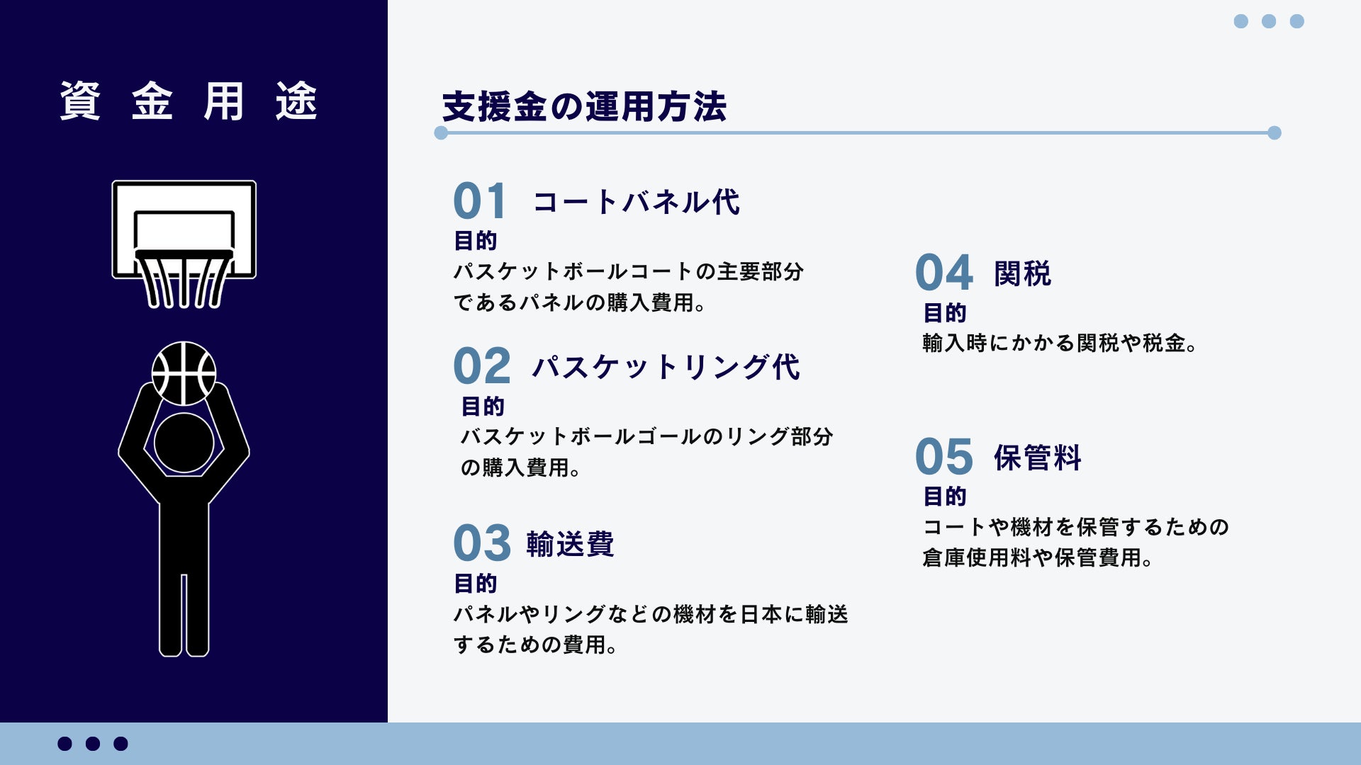 今回のクラウドファンディングでは、移動可能なバスケットボールコートの購入資金として、500万円のうち100万円を目標としています。このコートがあれば、地域のさまざまな場所でイベントやクリニックを開催し、もっと多くの子どもたちにバスケットボールを楽しんでもらうことができます。特に地方創生や地域活性化を目指し、以下のような活動を展開していきます。