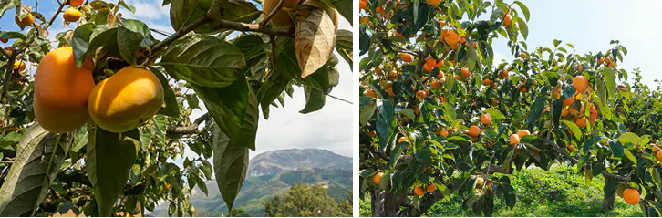 今回のカッサータに使用する平核無柿は伊吹山の麓で栽培される柿で昼夜の寒暖差が激しい伊吹山特有の自然環境が美味しい柿に育ちます。生産においては環境のことを考慮に入れ、化学肥料等の使用を平均の5割以下に制限し、滋賀県の「環境こだわり農産物」の認定を受けています。