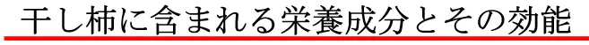 渋柿は干すことで渋味が甘さに変化し、水分が適度に抜けることでねっとりとした食感になります。そんな干し柿の良さは豊富な栄養と効能にあります。干し柿の主な栄養素には食物繊維、カリウム、βカロテン、タンニンがあります。