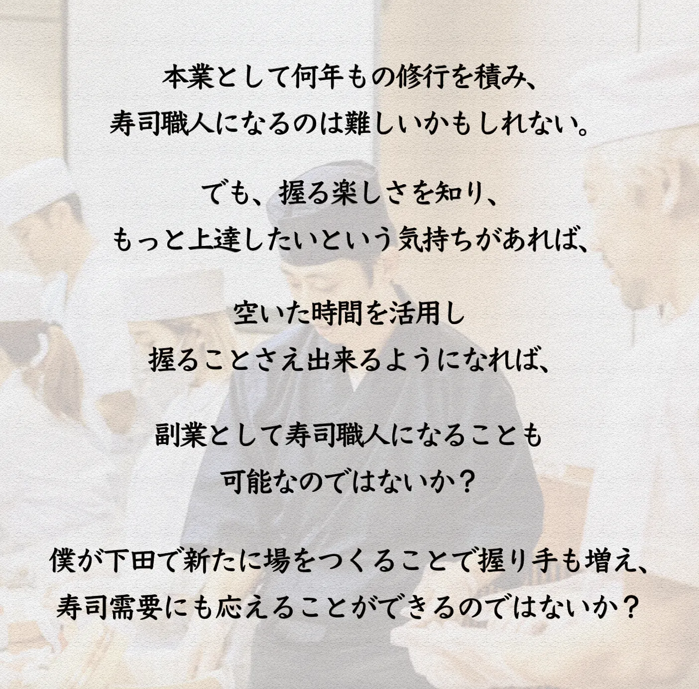 未来の仲間たち(副業寿司職人の皆様)に伝えたいメッセージを、下記にまとめました。
