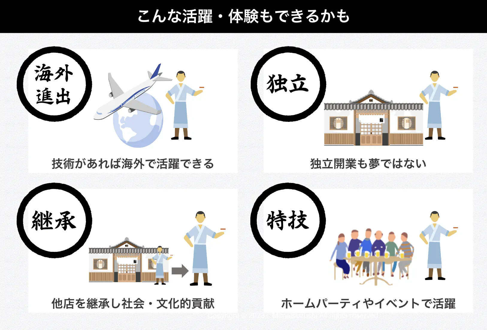 最初から全てを身につけるために修行するのではなく、接客や握ることが得意な人は板場に立つための勉強をし、魚を触ることが好きであれば仕込みを学べばいい。