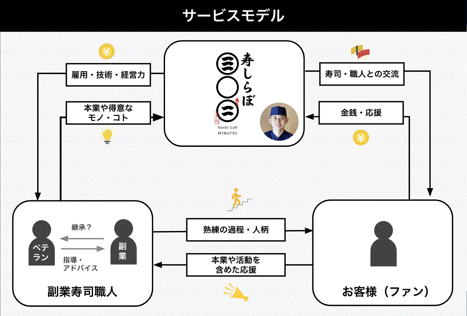 そして、お堅いイメージの寿司屋を覆し、副業寿司職人さんの「成長過程」を一緒に楽しんだり、人柄や寿司以外での「つながり」を価値としてもらうことで、寿司屋に入るハードルも下がります。
