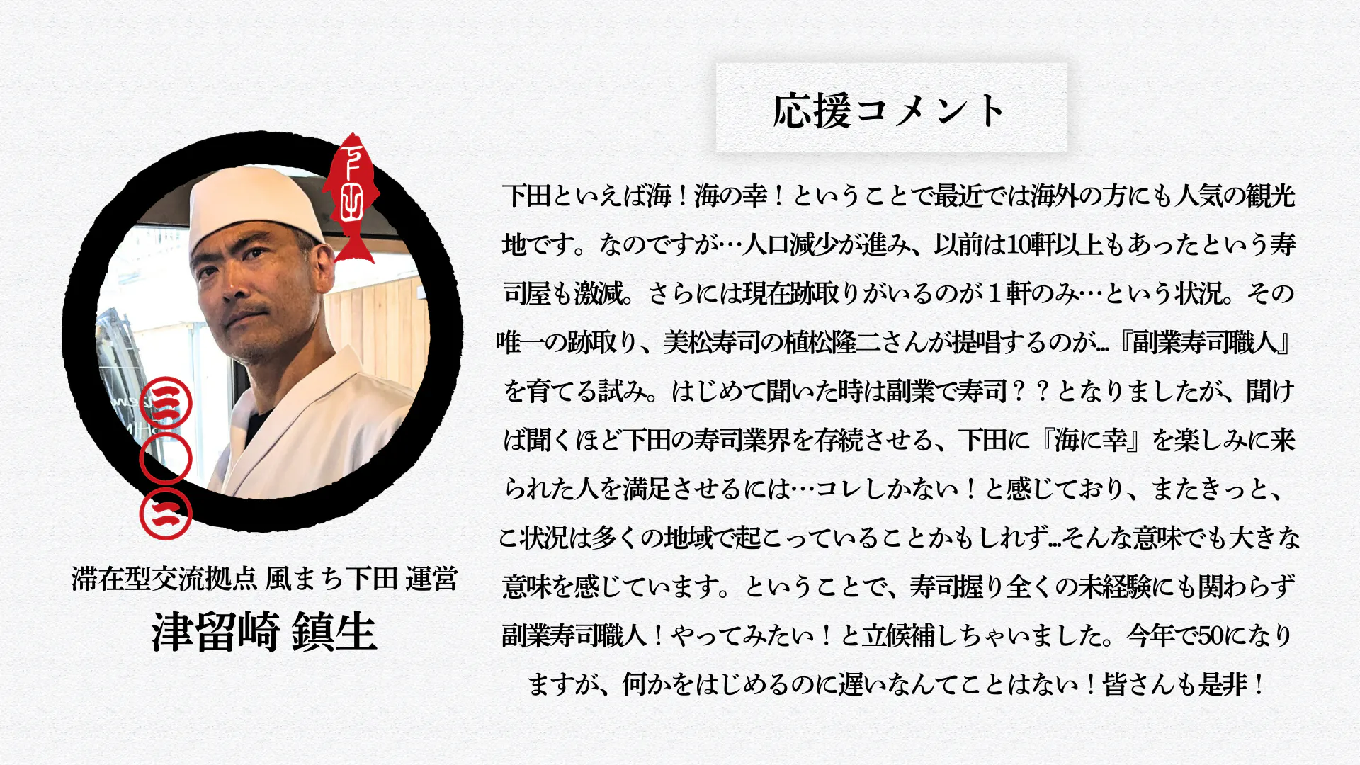 跡取りのいないところも多く、このまま何も手を打たなければ、豊富な魚介類が売りの観光地下田で「お寿司が食べられない」という未来がもうすぐそこまで来ていたのです。
