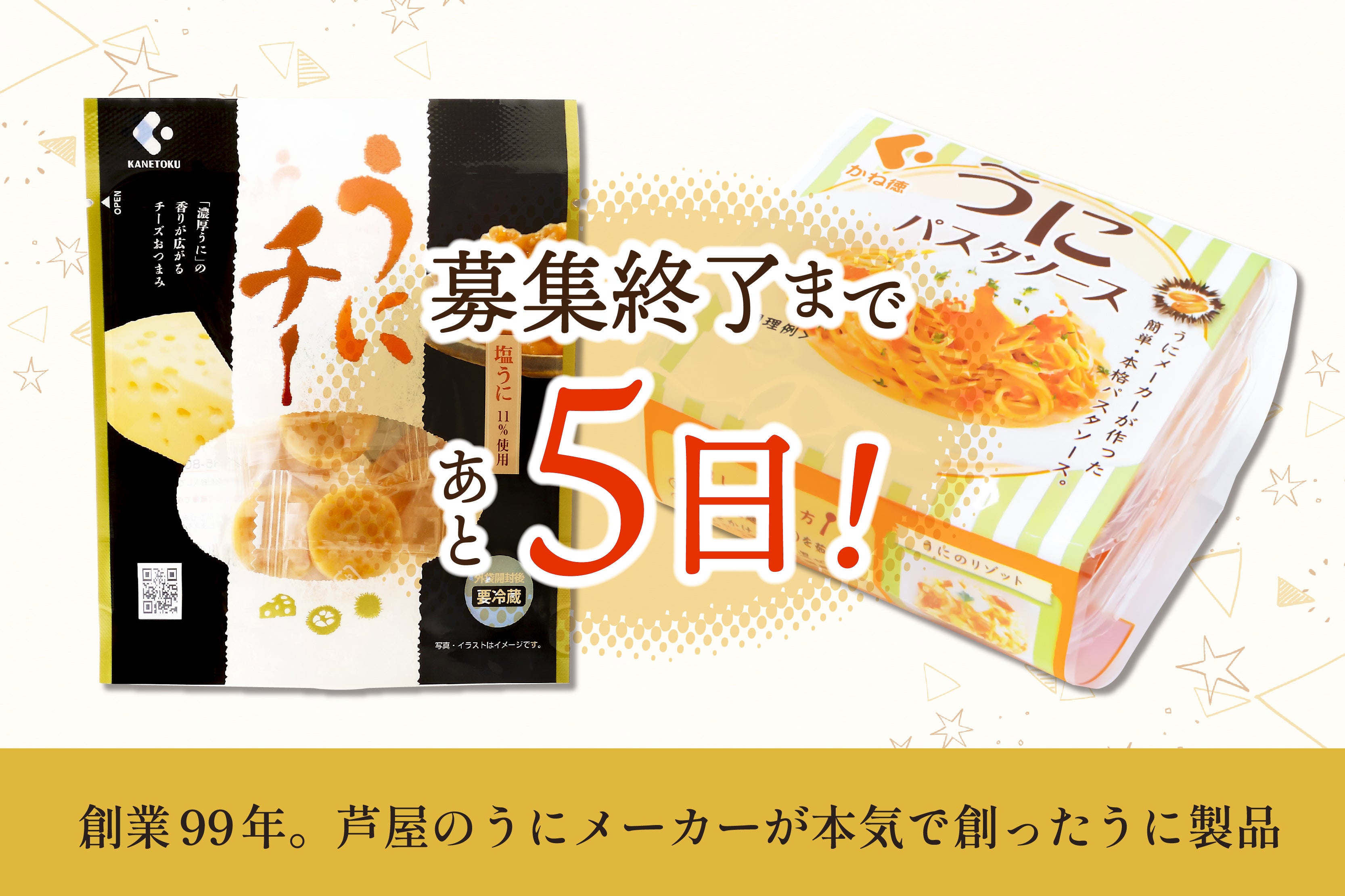 うに好きな方にも納得していただけるおいしさを目指した✹「うにチー」と「うにパスタソース」✹募集終了間近となりました!目標達成まであと一歩です。引き続き、応援のほどよろしくお願いします。5種類のリターンを用意しておりますので、老舗うにメーカーこだわりのうに味をぜひ試してみてくださいね!