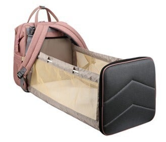 このバッグのすごいところは、背面のファスナーを開くだけでベビーベッドになること。公園やお友達の家、さらには旅行先で、いつでもどこでも赤ちゃんが快適に休めるスペースを確保できます。