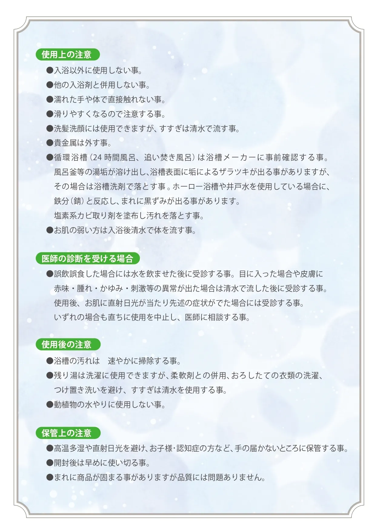 家庭用浴槽(200㍑)に対し本品1包(25g)を入れ、よく溶かし、かき混ぜてから入浴してください。