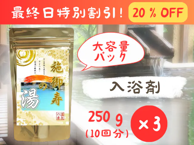 2024/10/11 09:02現在9:00より【最終日特別限定リターン品 】入浴剤「施御寿の湯」250g(10回分)5000円/個を3個セットで15000円 → 12000円の20%OFFで提供させていただきます!応援するよ~!まだまだ応援したりないよ~って方は支援してくれると泣いて喜びます!「限定10セット」のみですのでお早めに~最終日、最後まで見守ってくれると嬉しいです! もっと見る