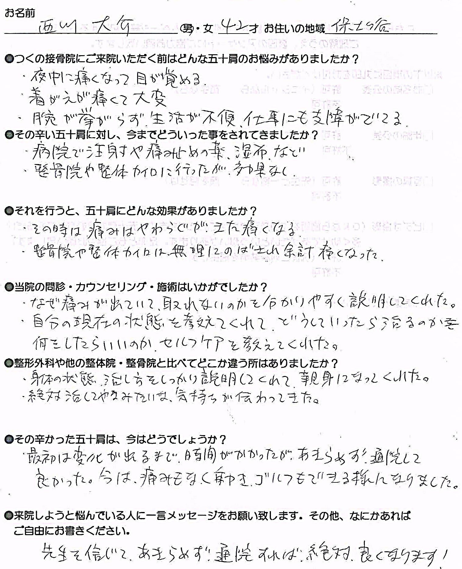 五十肩専門院として様々なお客様をみさせていただいて、こういった悩みをかかえている方が非常に多いです。特に多いのが、整形外科に行ったけど、何も変わらない。結局、注射や痛み止めしかしてもらえず、治し方も教えてもらえない。そんな方ばかりです。なので、私はこのプロジェクトを立ち上げ、多くの方に現状を知ってもらい、このような悩みを抱えている人をできるだけ減らしていきたいという想いがあります。もし、この記事を読んで、自分は五十肩になったことがなくても、知らない所で痛みで夜も眠れず苦しい思いをしている人が数多くいるんだということを知って頂けただけでも私には収穫です。そして、そういう方が頼れる場所を今後も諦めずに作っていきたいと思っております。是非ともご協力お願い致します。