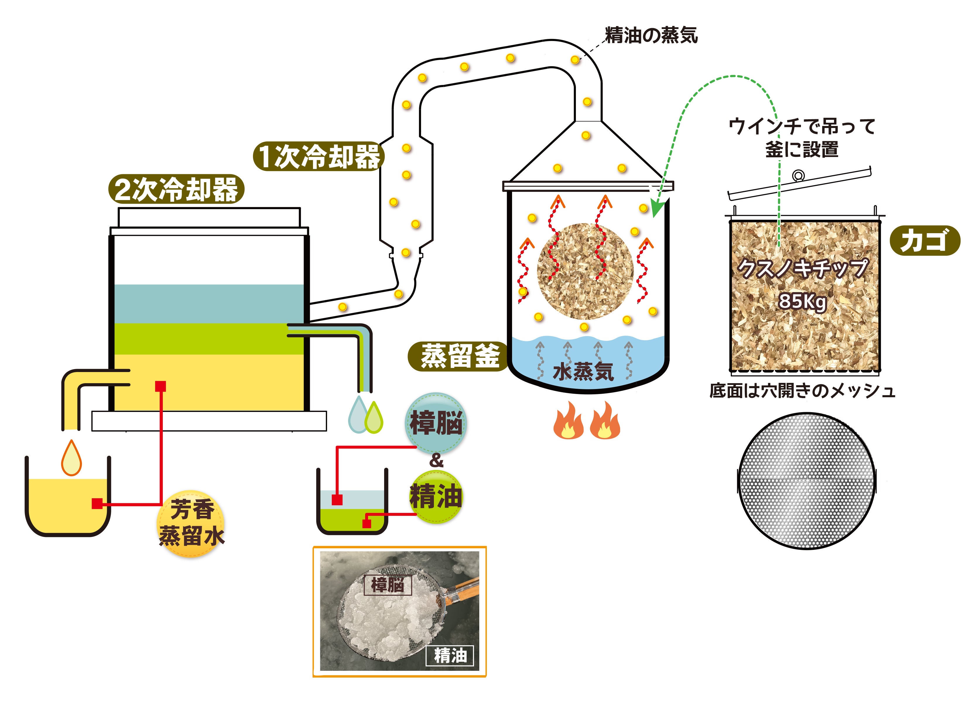 また、クスノキの水蒸気蒸留からは、天然しょうのうとともに精油(樟脳油)、芳香蒸留水も同時に抽出されます。これらもクスノキの香りを手軽にお楽しみいただけるアイテムとして商品化しています。