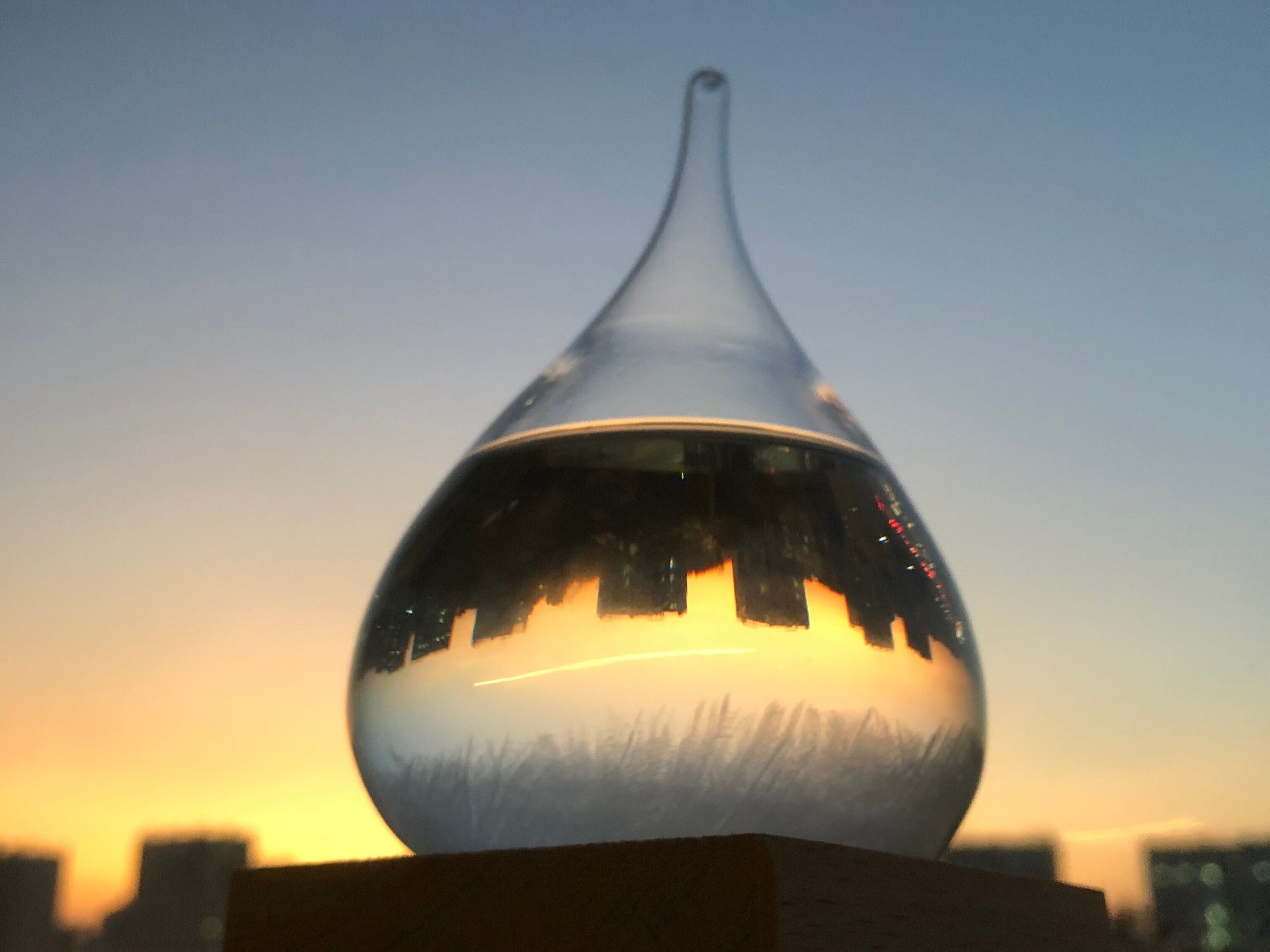 ストームグラスはガラス容器入った液体の結晶化の様子を観察することで、天候の変化を予測できるとされているものです。その中の結晶が天然しょうのう。晴れの日は液体が透明になり、雨や曇の日は液体が濁るという不思議、美しい結晶の変化を楽しめます。