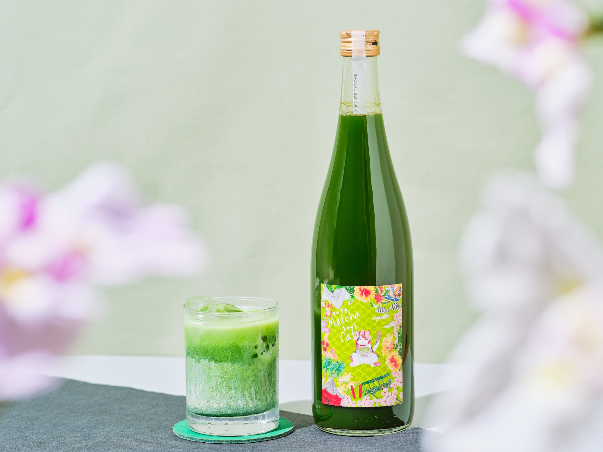ラベルは抹茶をイメージしたグリーンカラーがベースとなっており、製造蔵元である濵田酒造さんの所在地、鹿児島県いちき串木野市の伝統的なお祭り「さのさ祭り」の傘かむりを被っている愛嬌のある三毛猫が、抹茶を飲んで一息ついているシーンがデザインされています。ペアリングには、パイナップルや柑橘系のフルーツを。