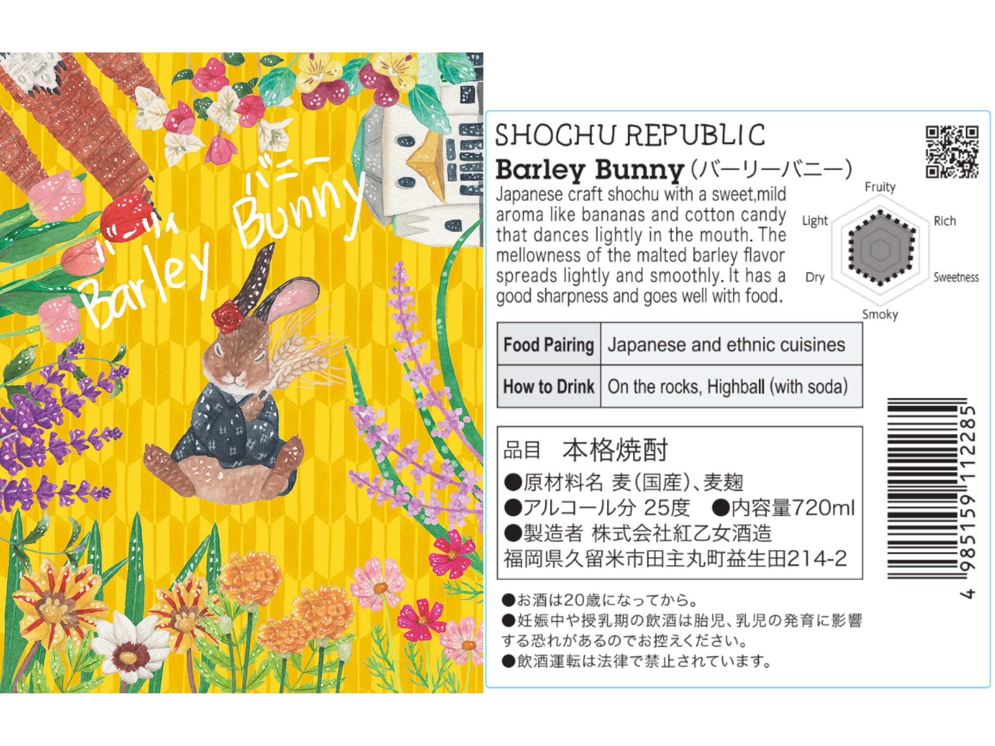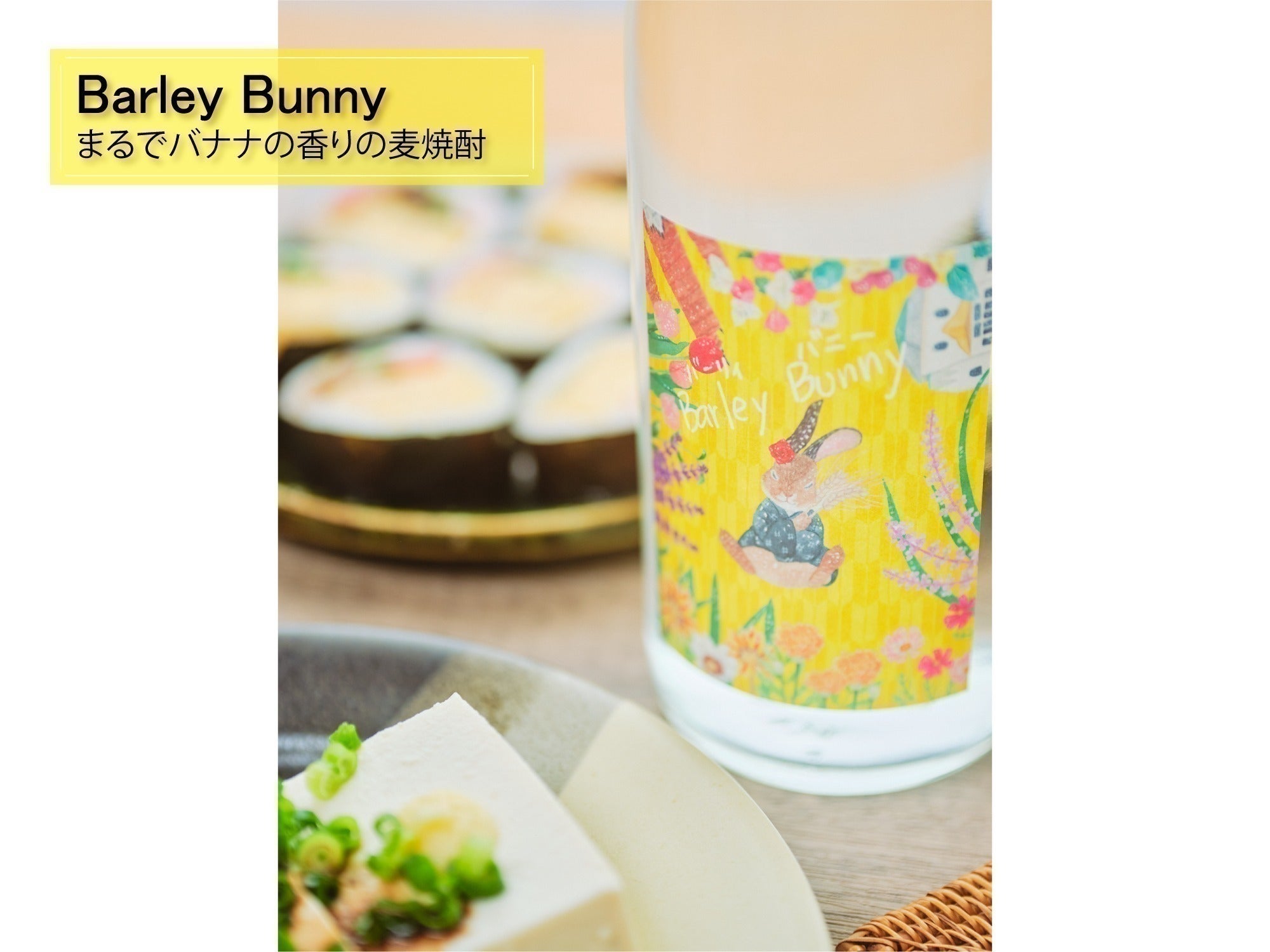 ラベルはバナナをイメージした黄色がベース。愛らしいニホンノウサギが原料にも使用されている二条麦を抱きしめつつ、気持ちの良い風を感じているようで、このお酒の爽やかな酒質をよく表しています。さらにバラの耳飾りと製造蔵元、紅乙女酒造さんの地元福岡県久留米市の重要無形文化財、久留米絣模様の着物を着ているのがデザインのこだわりです。
