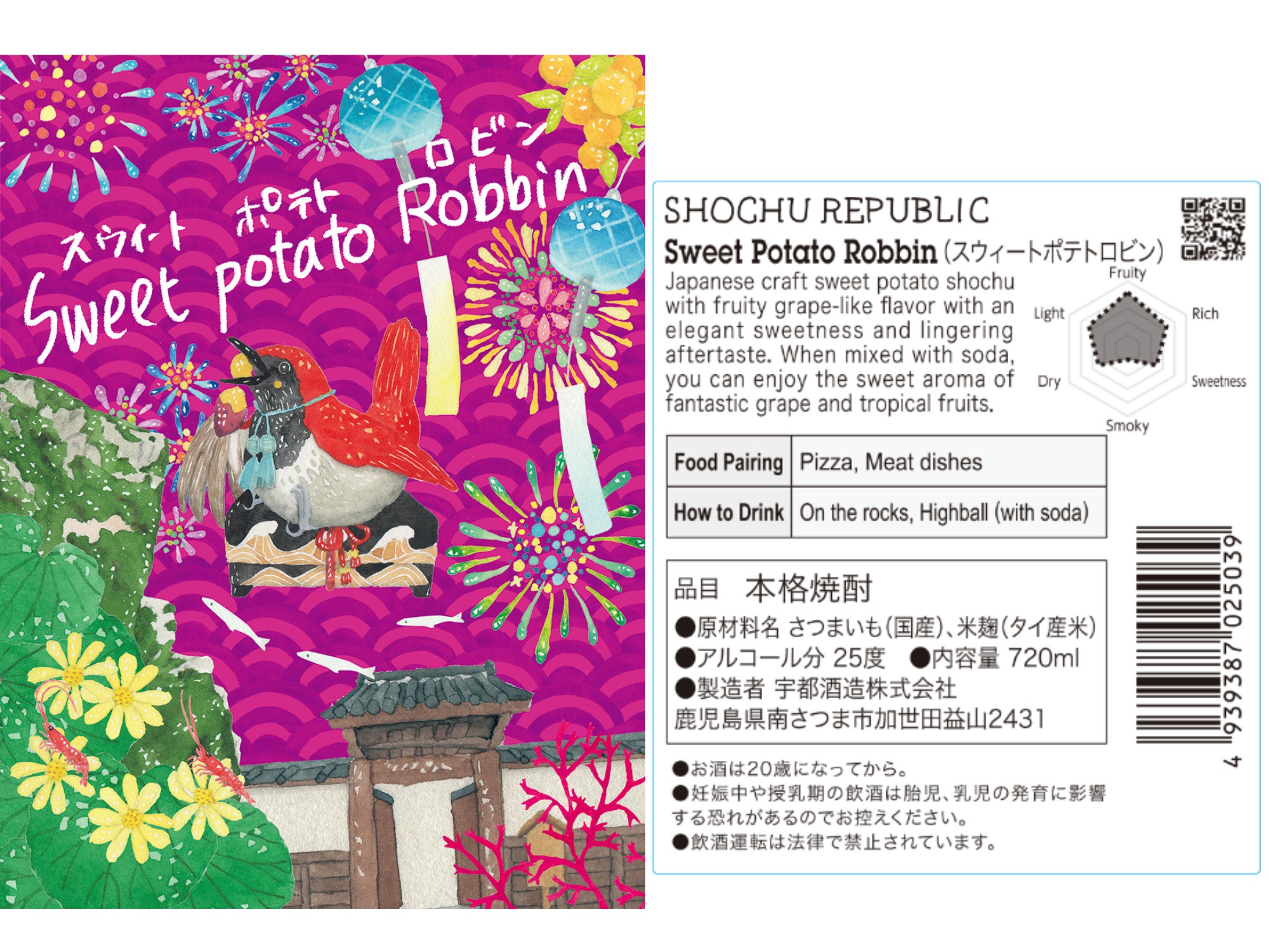 製造蔵元、宇都酒造さんのある薩摩半島は浦島太郎伝説発祥の地と言われており、ラベルは鹿児島県の南西諸島にのみ生息する日本の固有種で天然記念物のアカヒゲが房飾りをつけ、玉手箱に乗ってサツマイモを頬張っている様子をデザインしました。薩摩切子の風鈴や、よーく見ると南さつま市で作られる鹿児島県ブランドきんかん春姫も。清涼感あふれる酒質が伝わってきます。度数は25 度。