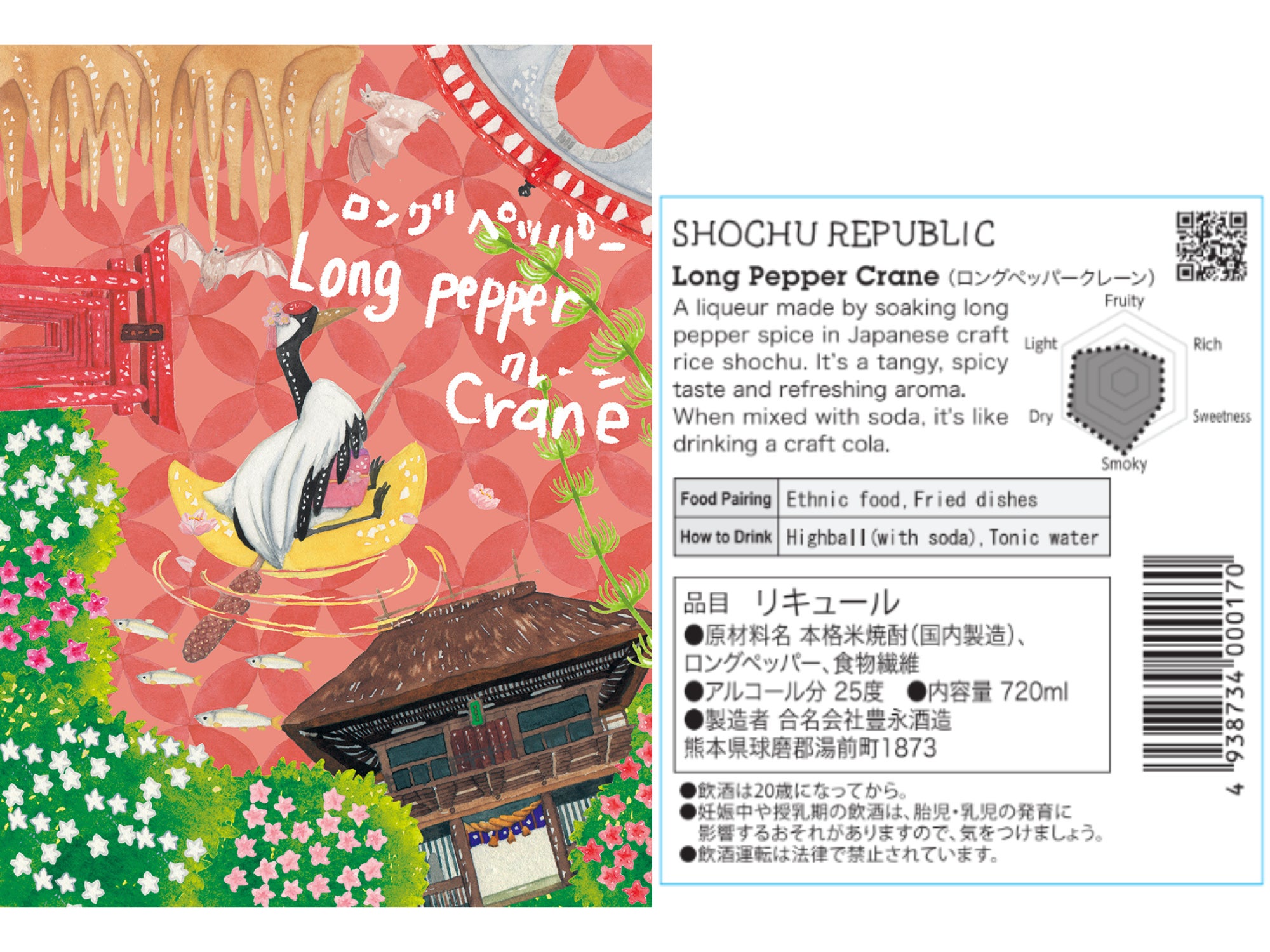 ラベルには製造蔵元、豊永酒造さんの所在地、熊本県人吉市の国宝、青井阿蘇神社を。また球磨郡に位置する九州最大の鍾乳洞、球泉洞を。タンチョウがロングペッパーの櫂で月の小舟を漕いでいます。
