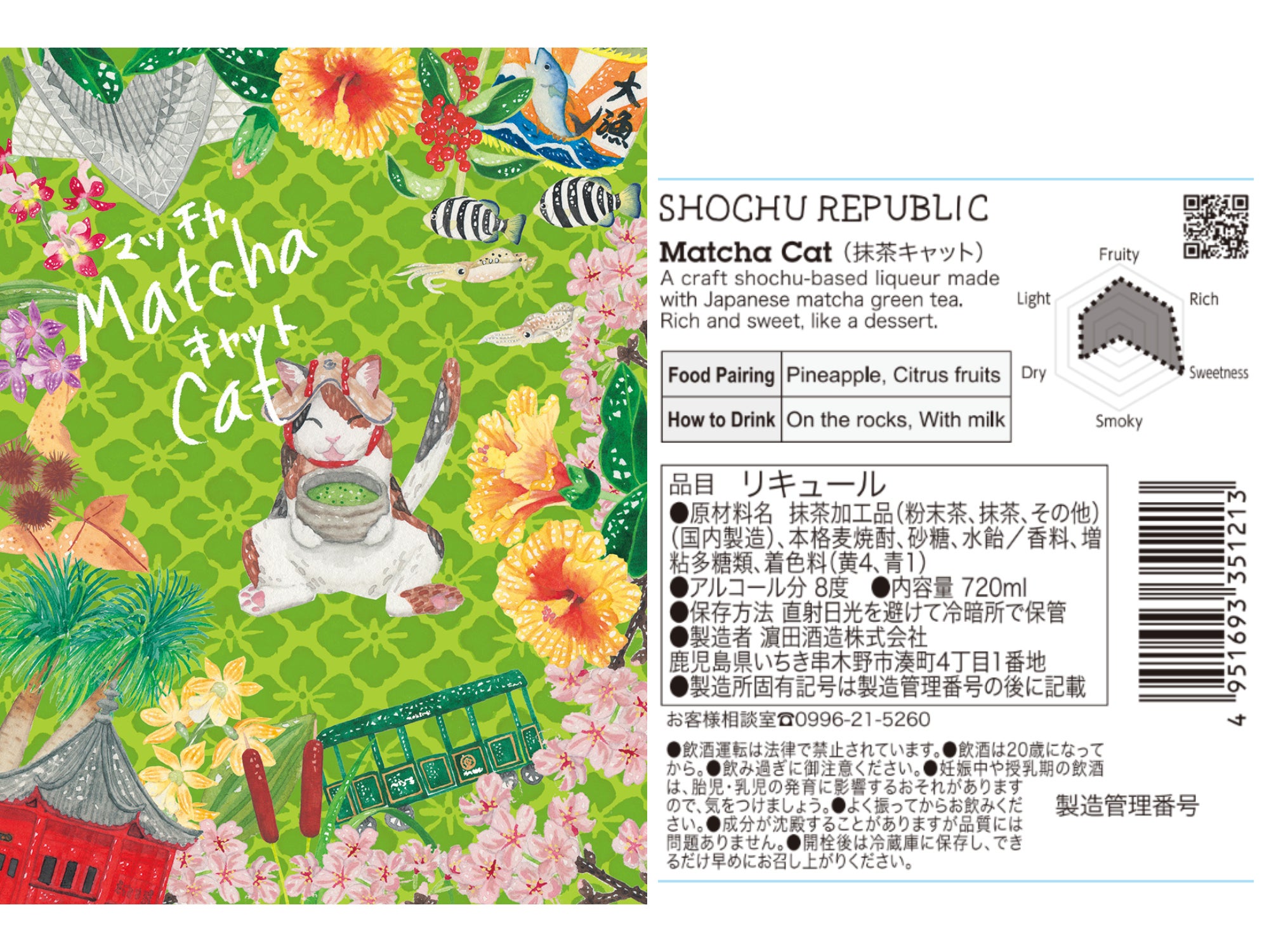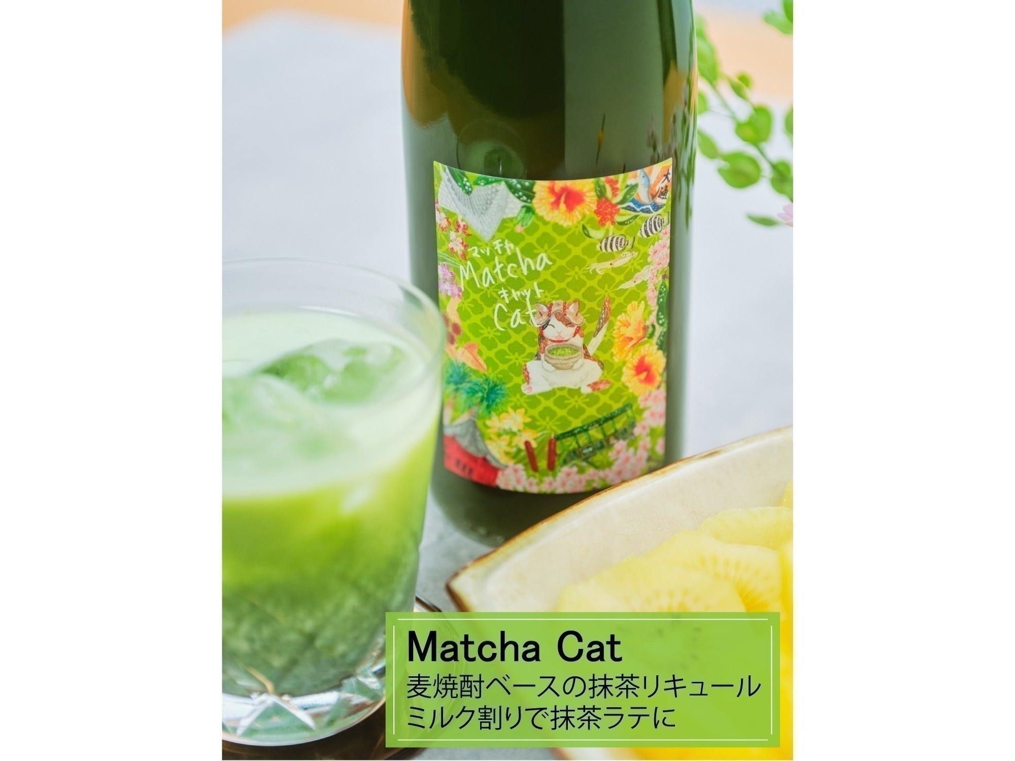 ラベルは抹茶をイメージしたグリーンカラーがベースとなっており、製造蔵元である濵田酒造さんの所在地、鹿児島県いちき串木野市の伝統的なお祭り「さのさ祭り」の傘かむりを被っている愛嬌のある三毛猫が、抹茶を飲んで一息ついているシーンがデザインされています。ペアリングには、パイナップルや柑橘系のフルーツを。