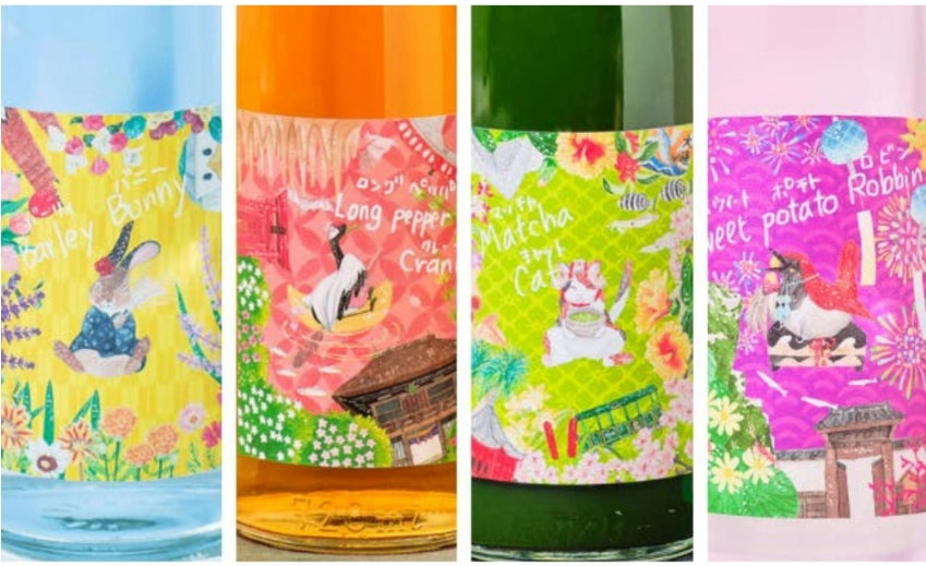 ラベルはバナナをイメージした黄色がベース。愛らしいニホンノウサギが原料にも使用されている二条麦を抱きしめつつ、気持ちの良い風を感じているようで、このお酒の爽やかな酒質をよく表しています。さらにバラの耳飾りと製造蔵元、紅乙女酒造さんの地元福岡県久留米市の重要無形文化財、久留米絣模様の着物を着ているのがデザインのこだわりです。