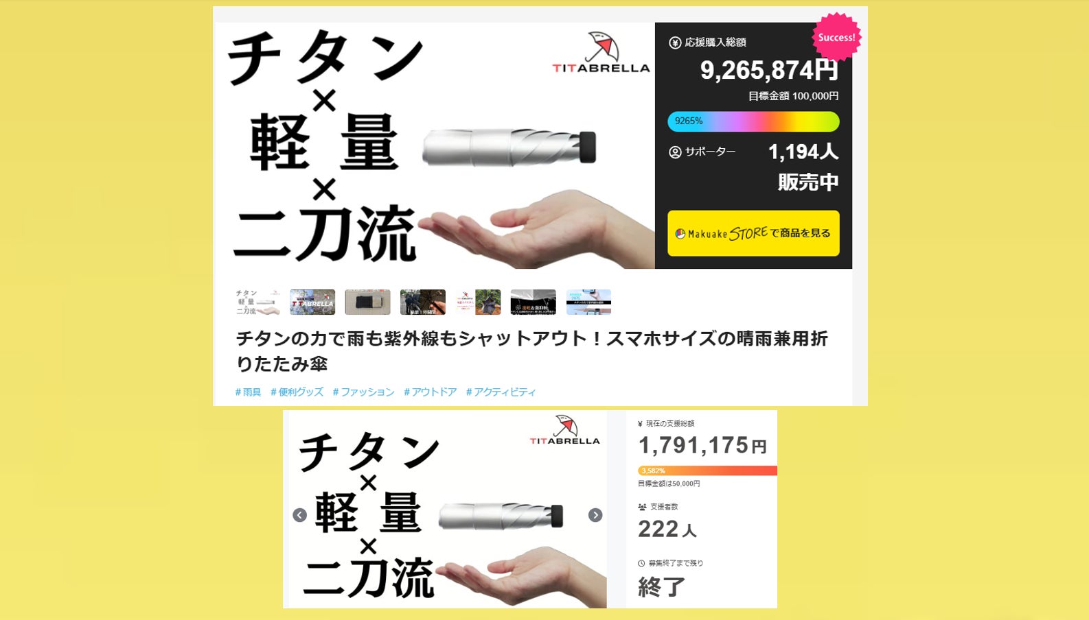 リターンの、チタン傘の発送が、全て完了いたしましたので、ご報告いたします。