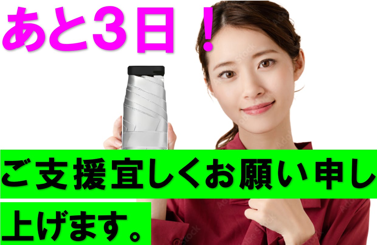 皆様、この度はご支援ご協力誠にありがとうございました。残り3日となりました。ご購入をご予定してました方へご購入お忘れではありませんか?ご購入を見送られました方へなお一層の改良を目指して、又、再びこの舞台に戻ってきます。https://camp-fire.jp/projects/763073/view?list=watched_projects