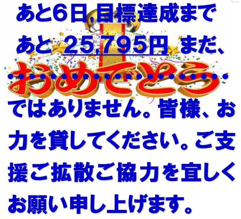 皆様のご協力のおかげで、目標金額を達成いたしました!本当にありがとうございました!あと残り5日ですが、皆様の更なるご拡散ご支援をよろしくお願い申し上げます。