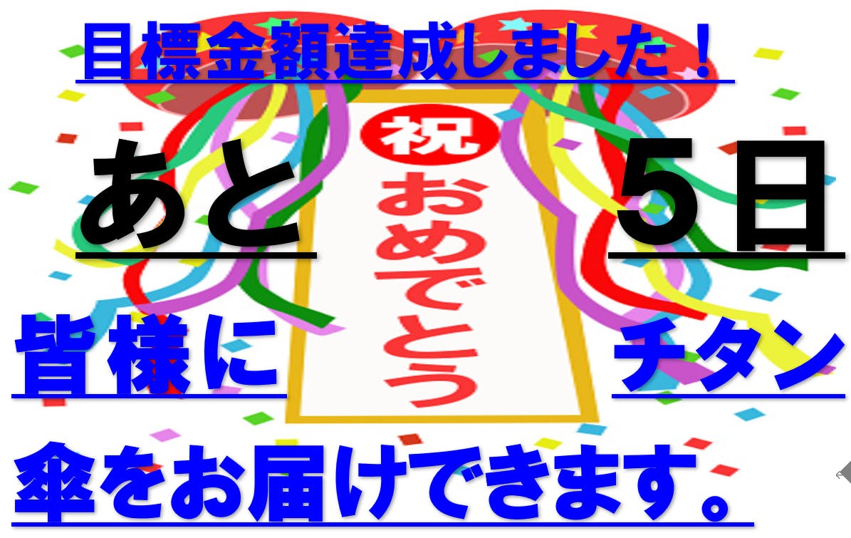 一番人気は、3個セット割11800円です。もうすぐ終了です、あと7日、目標金額まであと3万円!皆さんいつも暖かいご支援ご購入本当にありがとうございます。残り7日,今現在目標の93%達成。これもひとえに皆様方のご拡散のご協力のたまものであります。皆様のお力で成功させるべく引き続きなお一層のご支援ご拡散ご購入よろしくお願い申し上げます。https://camp-fire.jp/projects/763073/view一番人気は、3個セット割11800円です。その理由は、1個あたり3933円だからです。定価8000円のチタンWコーティングの傘です。最後のお願いです。目標達成しないと、このプロジェクトは無かったことになってしまいます。皆様、宜しくお願い申し上げます。