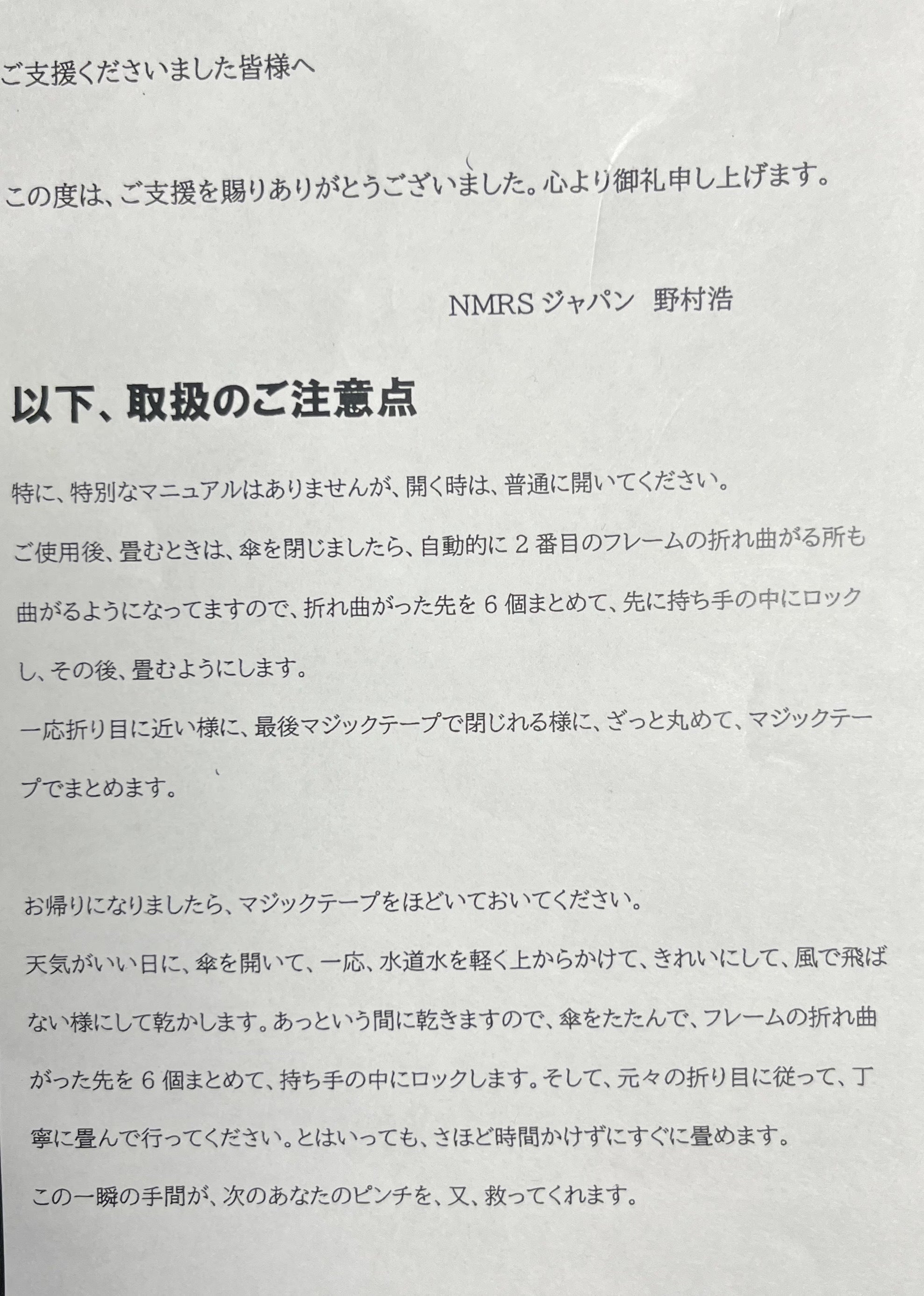 2025/04/25 16:11本日より、順次、リターン品の傘の配送を始めております。傘自体は、特別な仕掛けなどはありませんし、むしろ普通の傘よりも、名にも気をつけなくても開く傘ですので、ご使用後のお手入れの際の注意点という程のものでもございませんが、畳んだ時に、フレーム6本を持ちての中に収納して固定した状態で、生地をたたむ事や、天気がいい時に、一度サッと水洗いし、天日干しして、すぐに乾くので、その後、丁寧にきちっと畳むことなどを、少し書かせていただきました。しかし、作業のミスで、その紙が入ってない場合もあるかもしれませんので、その場合はお許しください。宜しくお願い申し上げます。 NMRSジャパン 野村 もっと見る