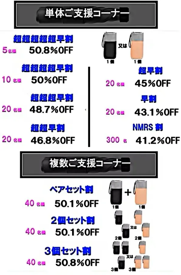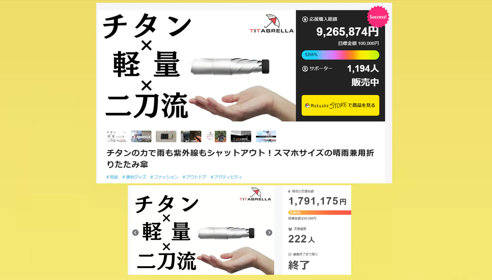 リターンの、チタン傘の発送が、全て完了いたしましたので、ご報告いたします。