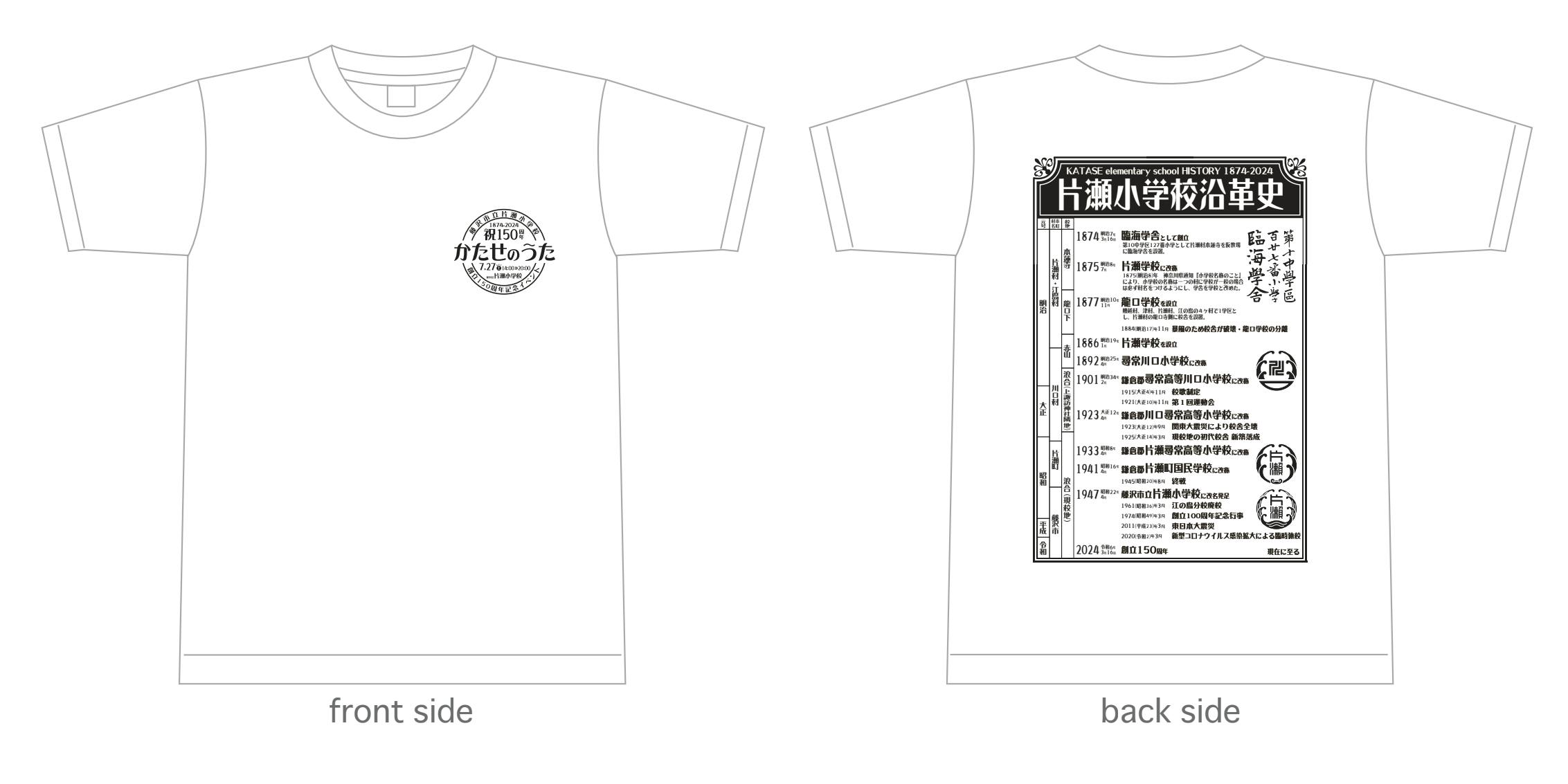 片瀬小学校の創立以来の変遷をデザインした「オリジナル記念Tシャツ」と片瀬小学校創立150周年を記念して作成した「記念誌」とイベント実行委員会からの感謝の気持ちを込めた「お礼メッセージ」をお送りします。