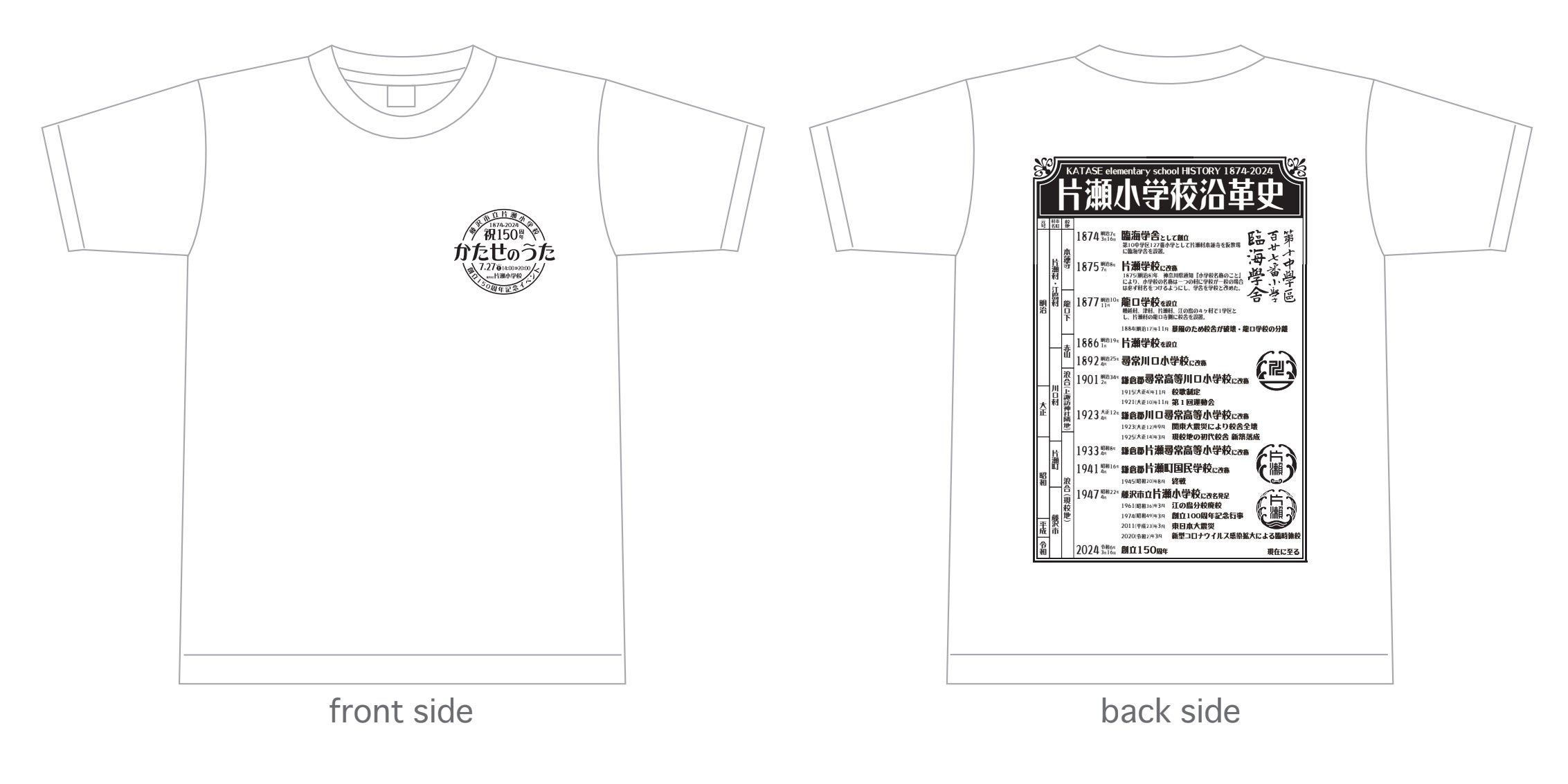 片瀬小学校の創立以来の変遷をデザインした「オリジナル記念Tシャツ」とイベント実行委員会からの感謝の気持ちを込めた「お礼メッセージ」をお送りします。