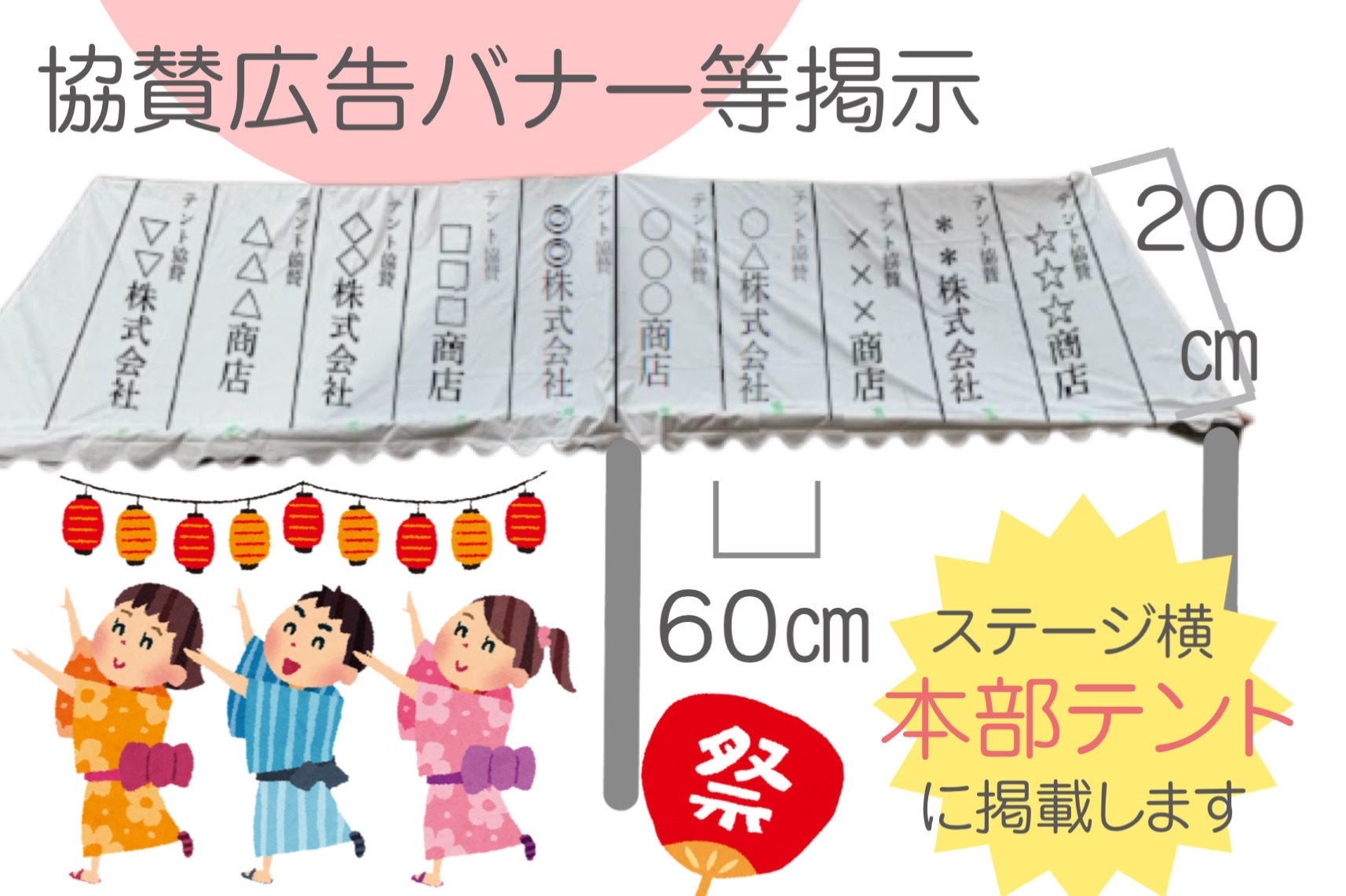 夏まつり実行委員会本部テントに協賛広告看板(縦約200㎝×横約60㎝)(メッシュターポリン)を掲載します。本部テントの位置として、祭りに訪れる大勢の方の目に入る場所です。なので宣伝効果は抜群です。