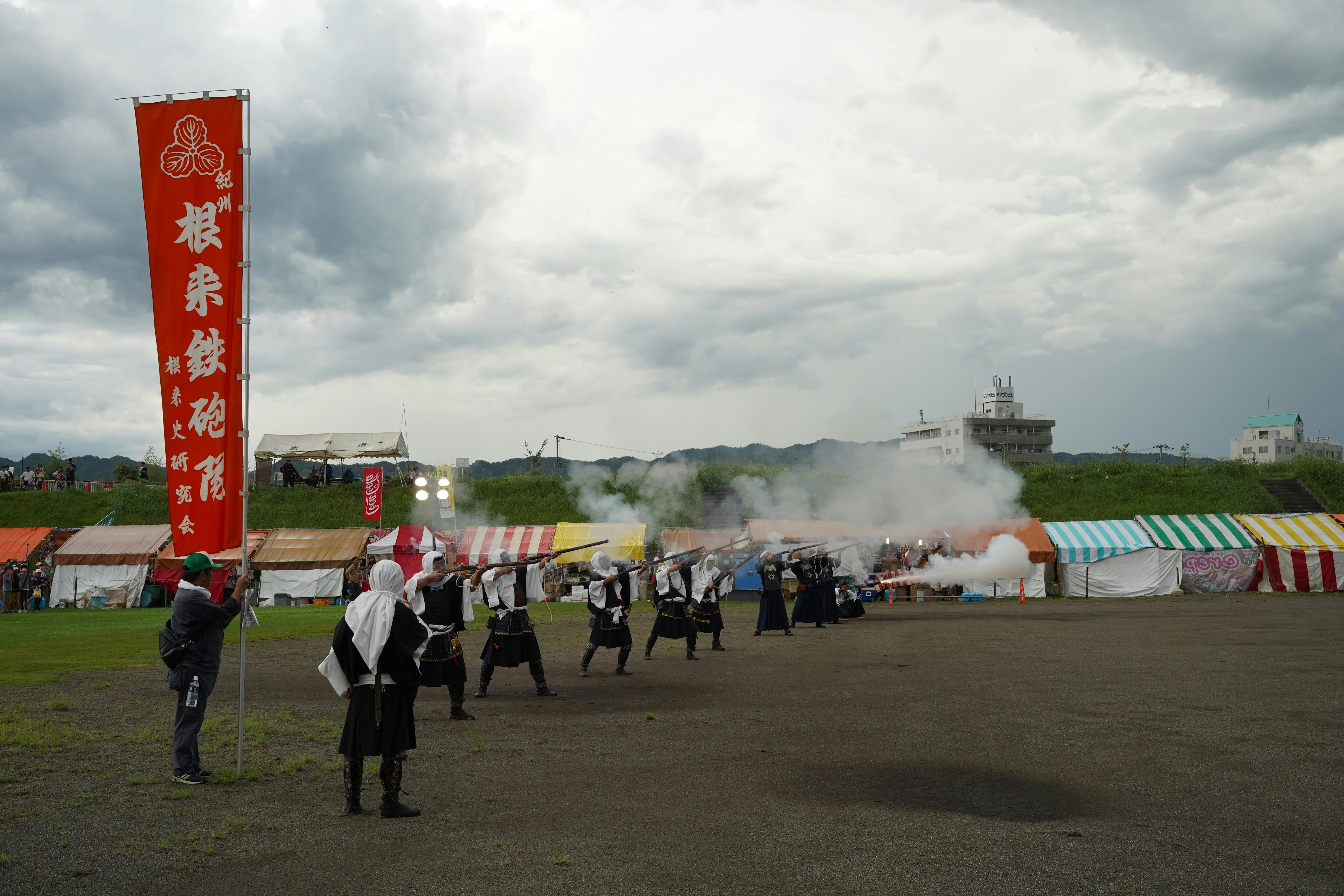 岩出市の根来鉄砲隊による迫力のある演武から夏まつりがスタートします。
