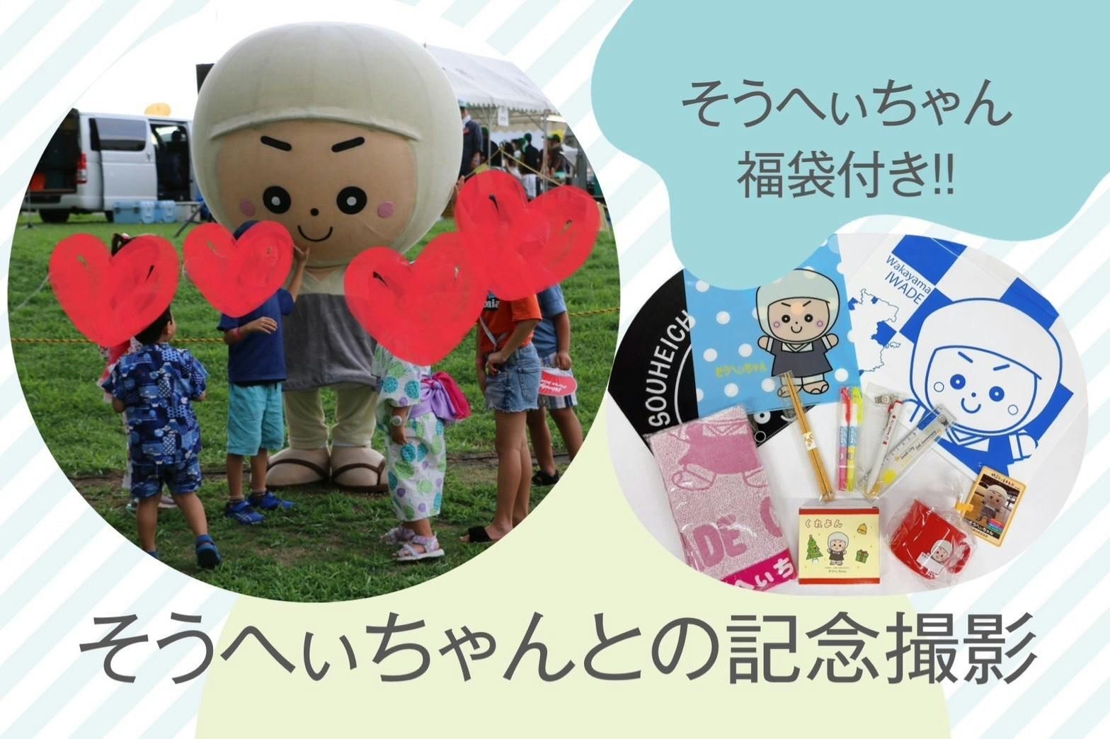 こどもから大人気!岩出市イメージキャラクターそうへぃちゃんと一緒に写真を撮る事ができます。 記念撮影の後に、超レアで入手困難なそうへぃちゃんぬいぐるみ(高さ約30㎝・横幅約20㎝)とそうへぃグッズ福袋(タオルやコップなど)も提供します!