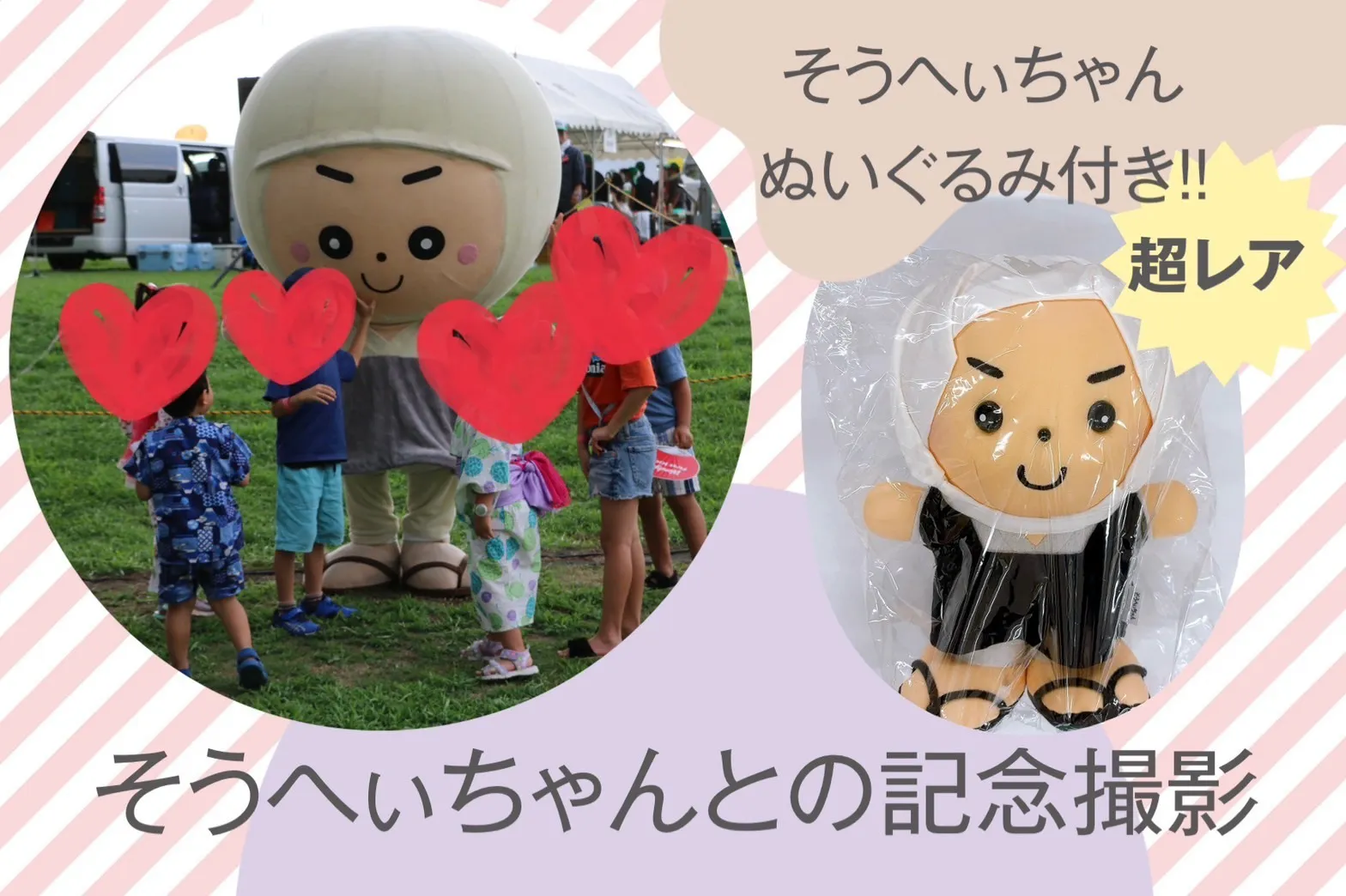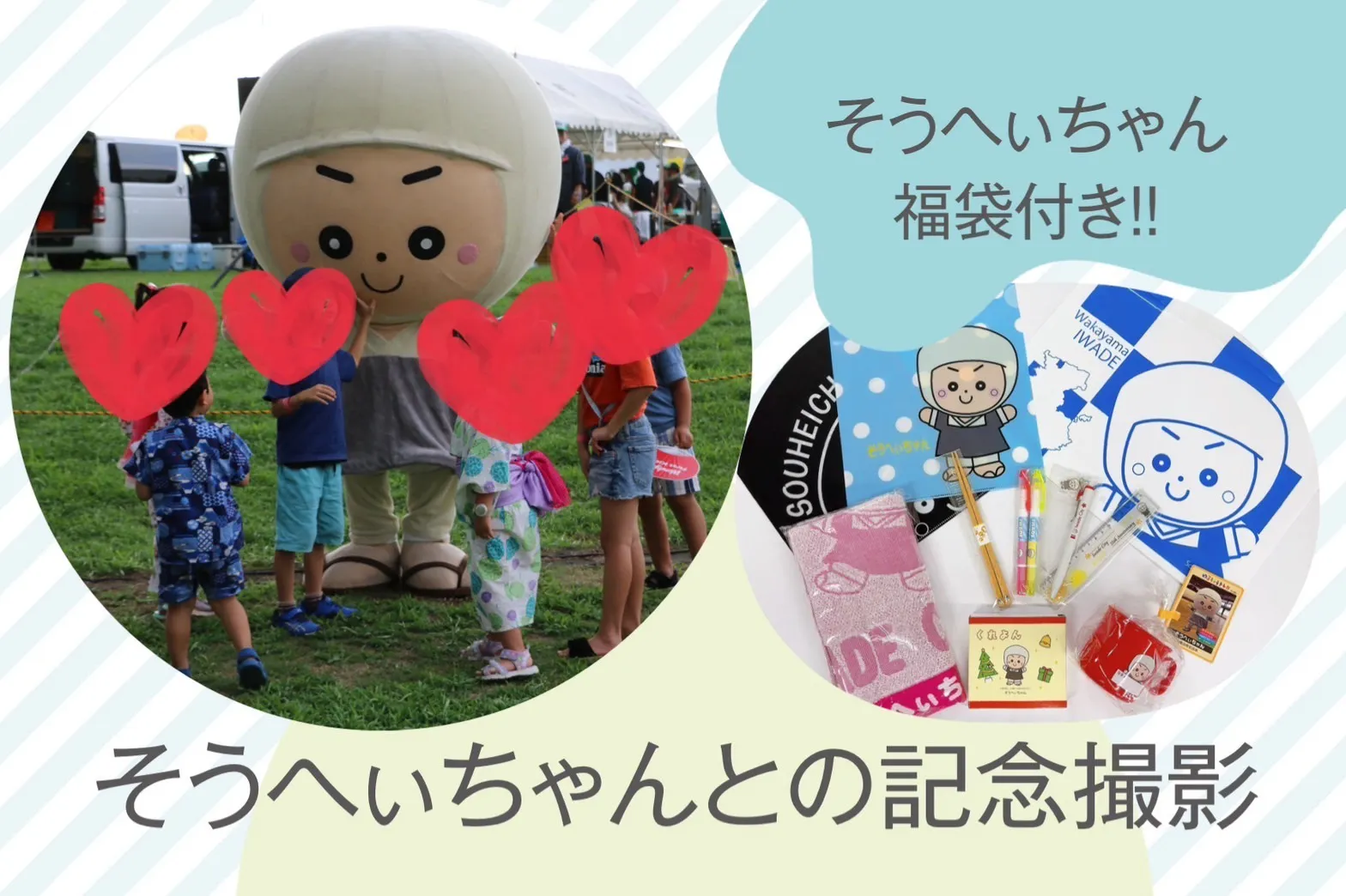 記念撮影の後に、そうへぃちゃんのグッズ福袋(タオルやコップなど)も提供します!