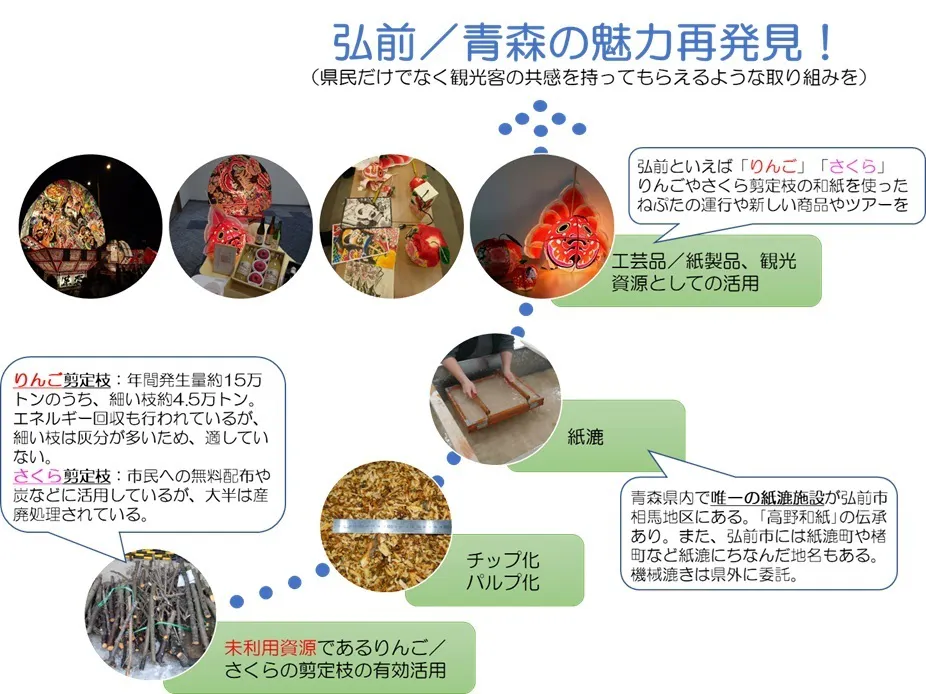 青森といえば「りんご」と「ねぶた/ねぷた」などの祭り、ということで、りんごの未利用資源である剪定枝を活用(アップサイクル)した「和紙」(障子紙)でねぶたやねぷたの作製し、祭りで運行すること、さらに祭りの後に表彰状や燈籠、ポチ袋などに再利用することで、サステナブルな祭りを実現していくことを目標としています。