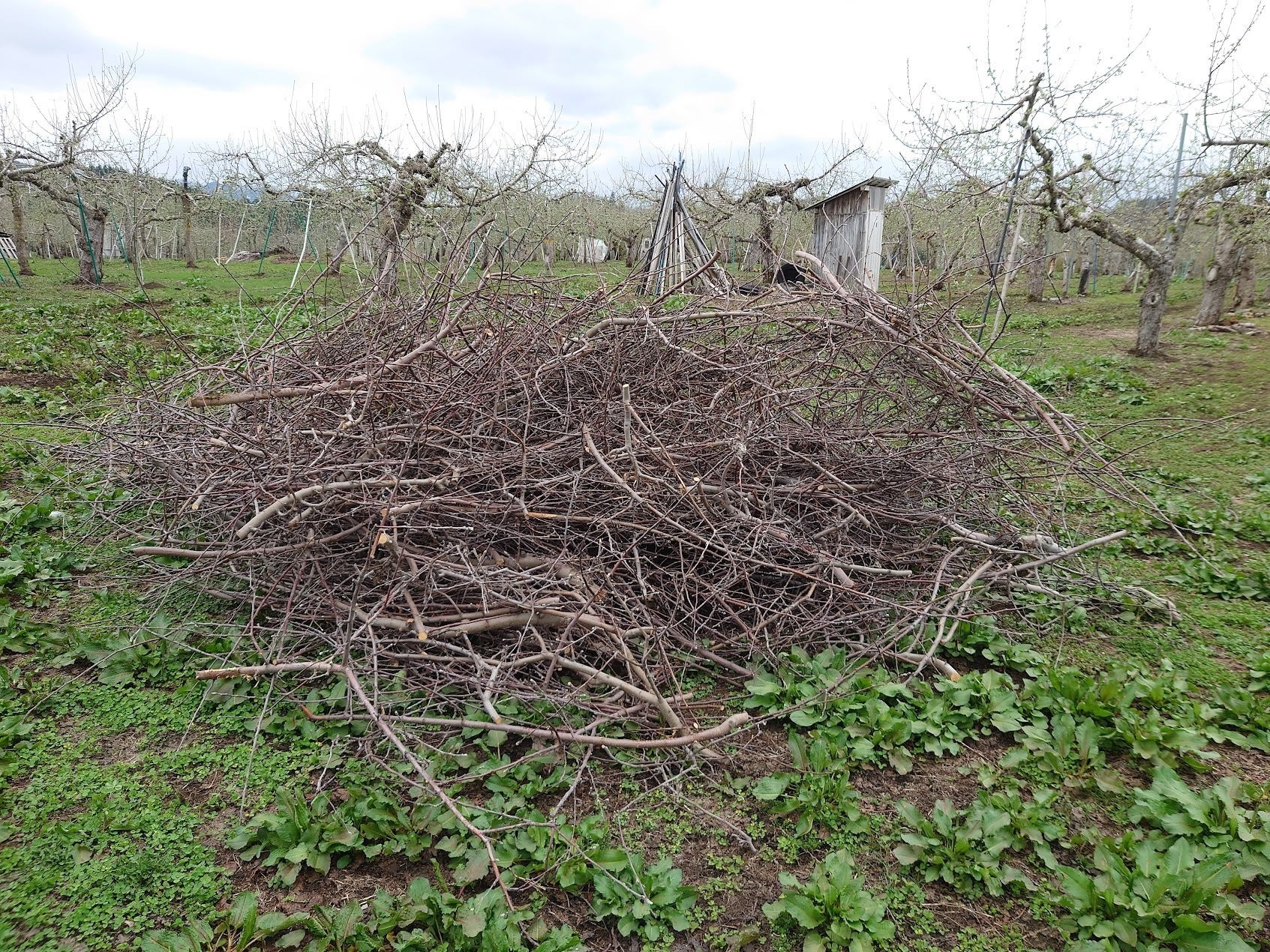 りんご剪定枝の年間発生量約15万トンのうち、3割を占める細い枝約4.5万トンの大半は園内で野焼されています(「青森県バイオマス活用推進計画」(平成23年12月発行)より)