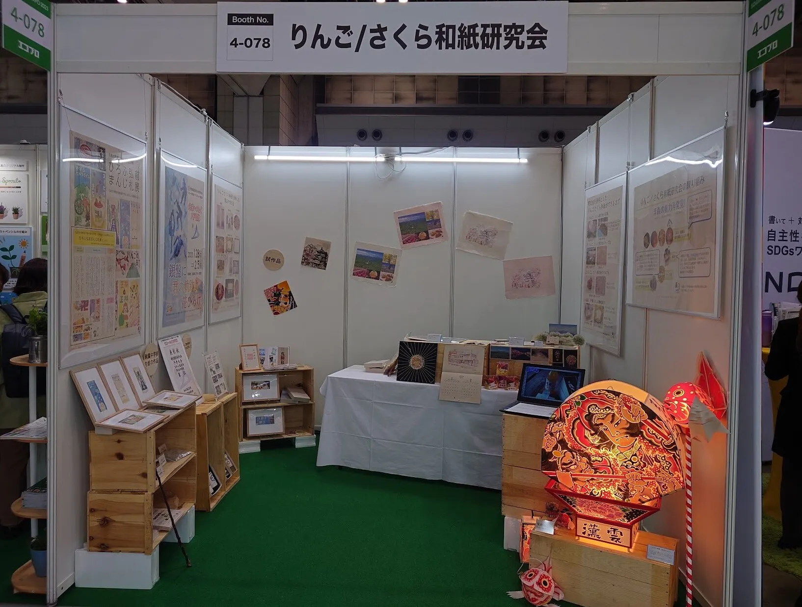 そこで、りんごやさくらの剪定枝等木材を用いてご当地の「和紙」を作製し、ねぷた、津軽凧など伝統工芸、お酒のラベルや絵はがき、など紙製品の他、紙漉き体験ツアーなどの観光資源化としての活用を目指し、コロナ禍で低迷していた青森の観光地としての魅力再発見、価値向上を目指すための活動として、2020年10月にひろさき産学官連携フォーラム内に「りんご/さくら和紙研究会」を設置しました(図5)。本研究会の取組みは、公益財団法人むつ小川原地域産業振興財団の研究助成に3年連続で採択され、工芸品や紙製品の試作品を作製したり(図6)、展示会に出展する(図7)などして、りんご/さくら和紙の普及を行ってきました。