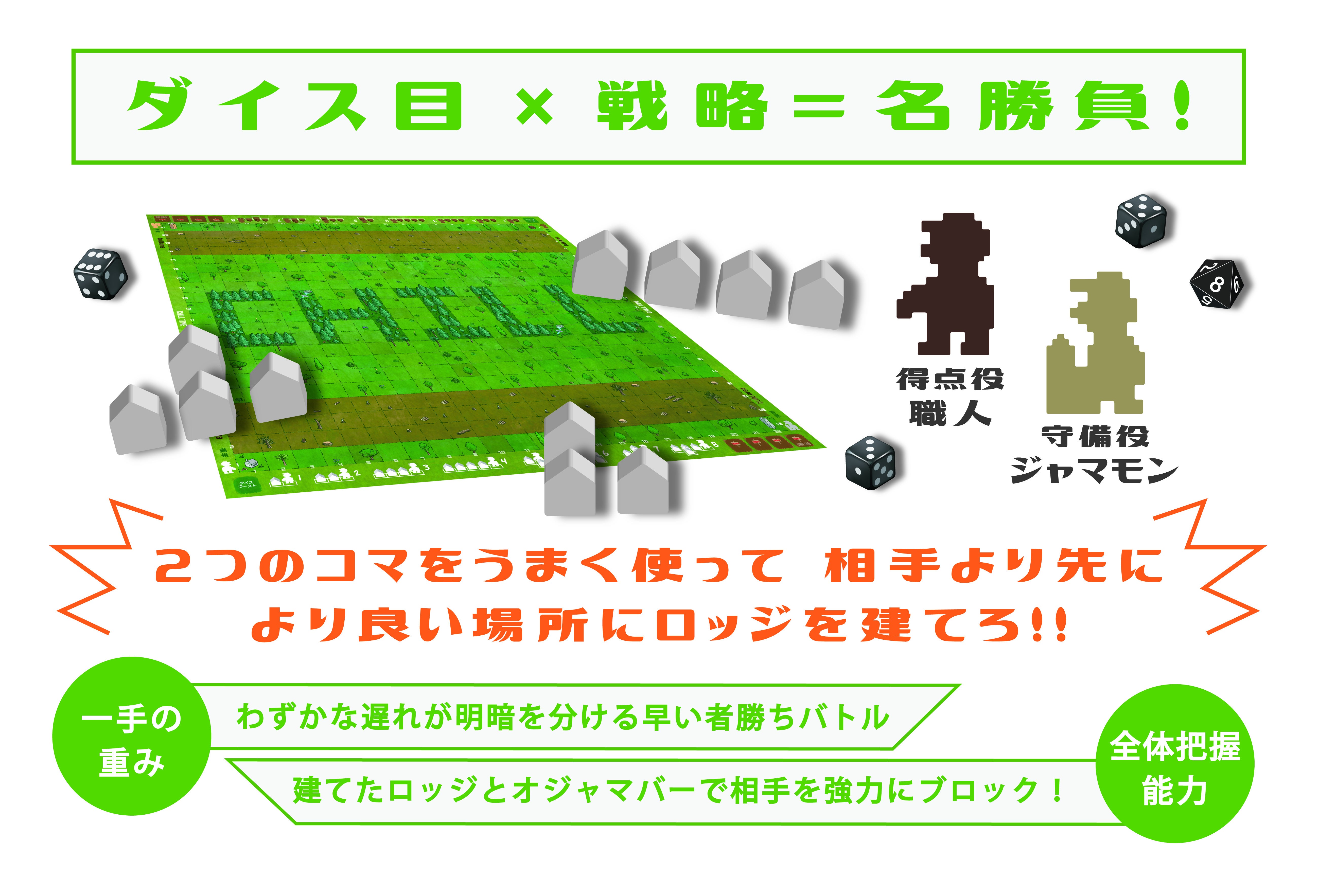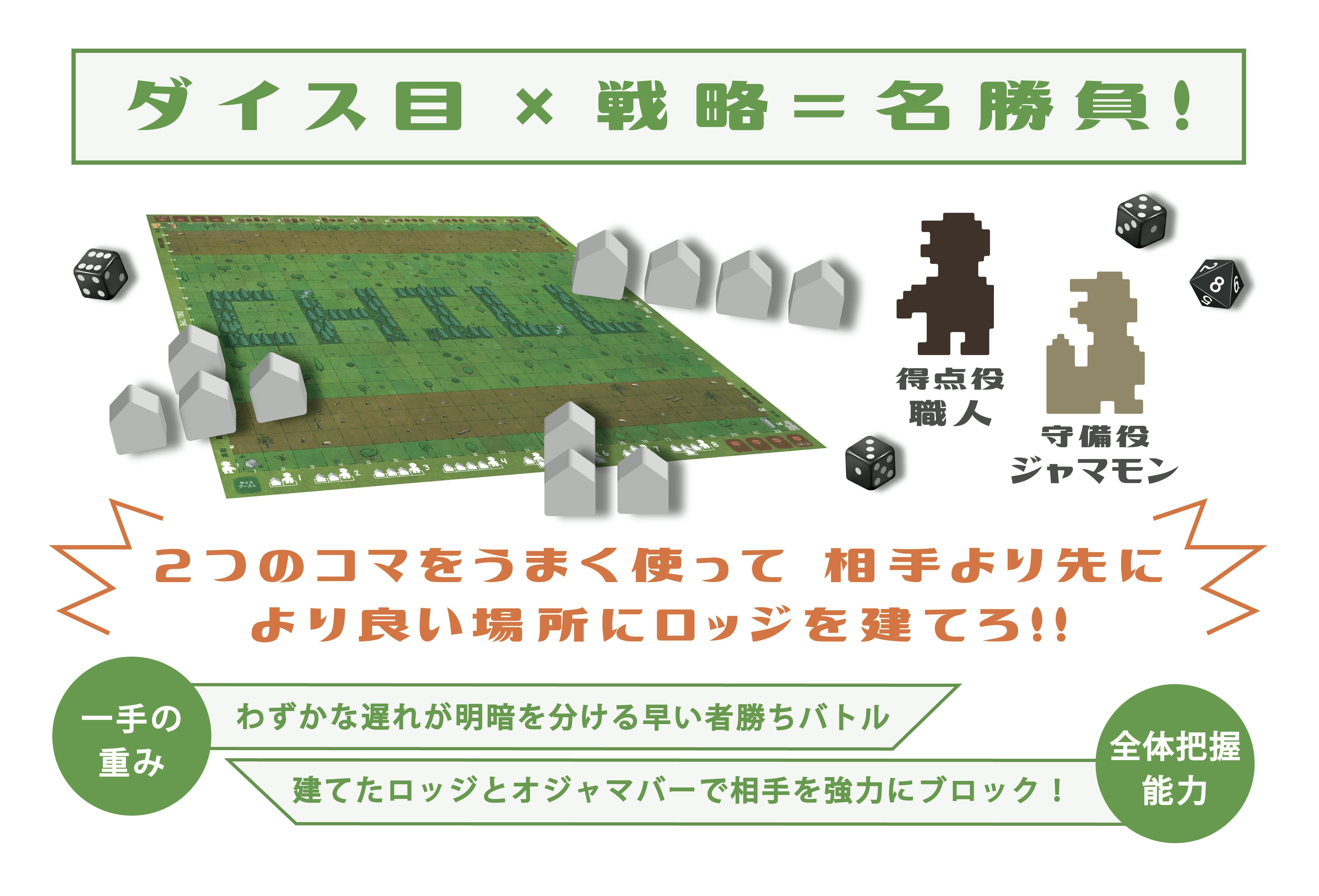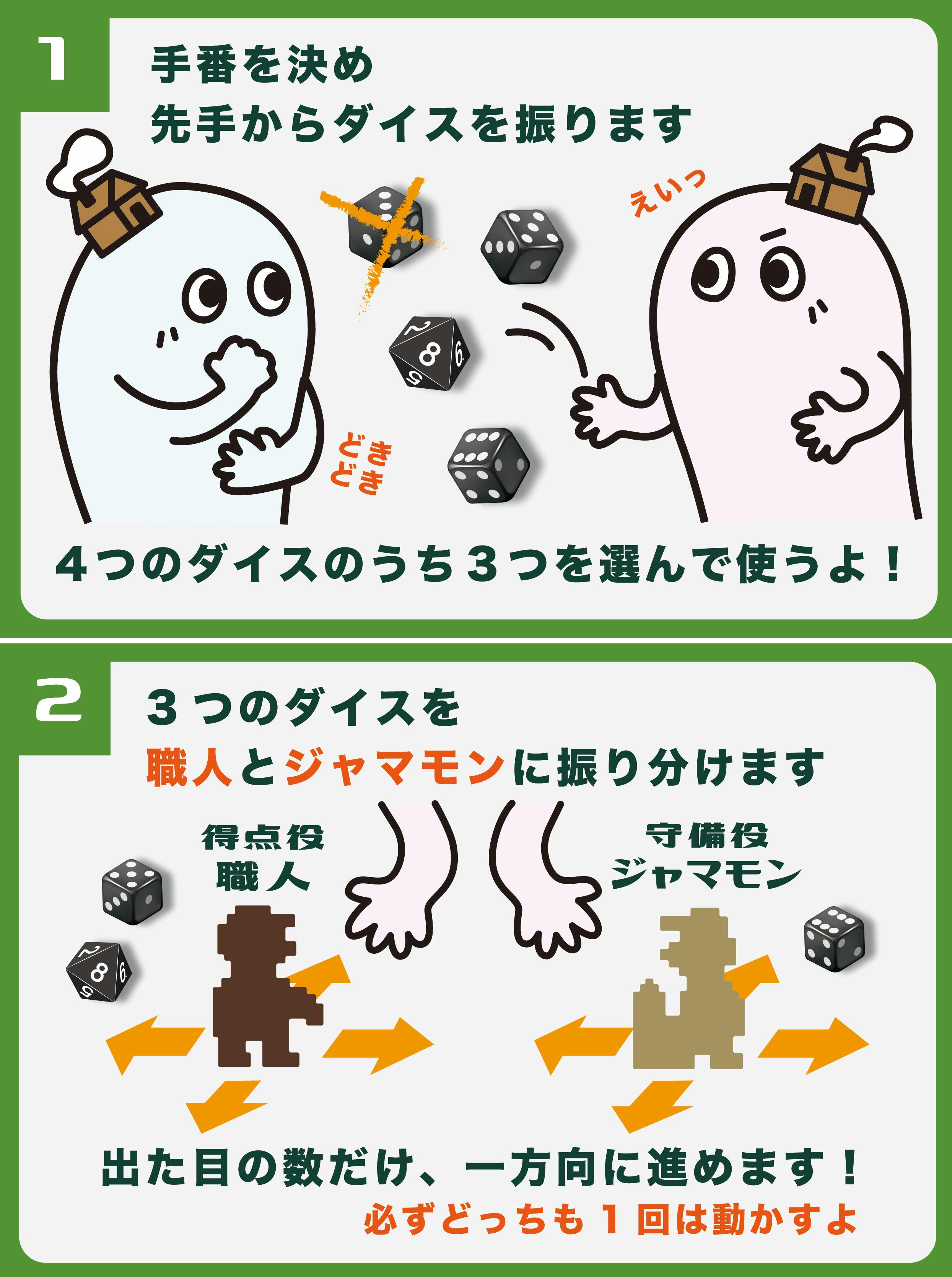 ダイスを振って 攻守2種類のコマを動かして得点を競う 2人用のボードゲーム